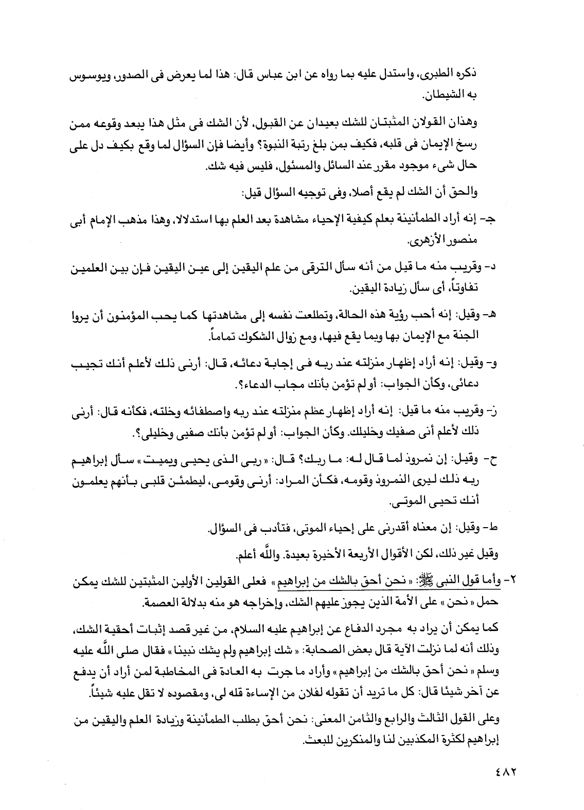 جـ- إنه أراد الطمأنينة بعلم كيفية الإحياء مشاهدة بعد العلم بها استدلالا، وهذا مذهب الإمام أبي منصور الأزهري.