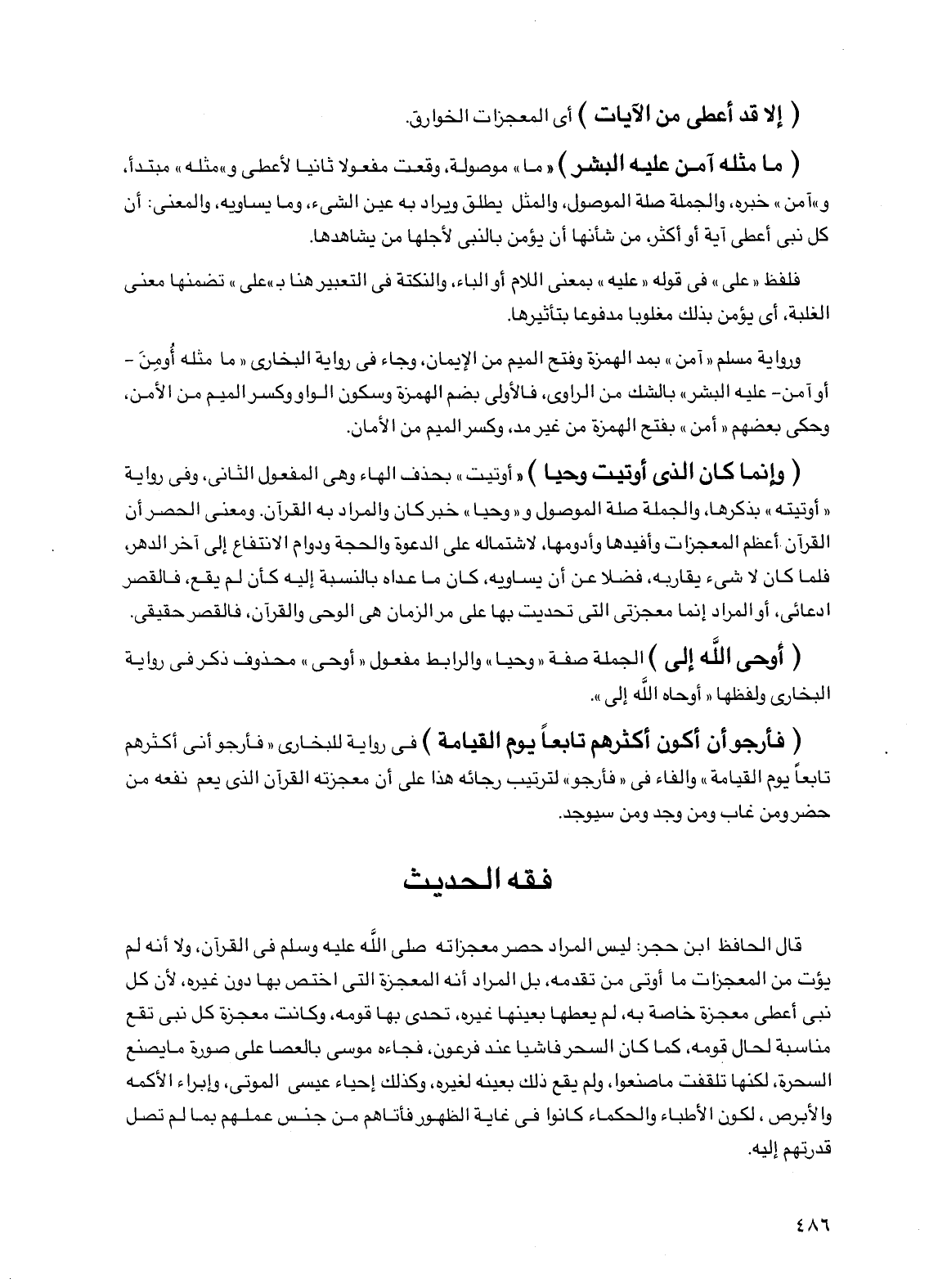 قال الحافظ ابن حجر: ليس المراد حصر معجزاته صلى الله عليه وسلم في القرآن، ولا أنه لم يؤت من المعجزات ما أوتي من تقدمه، بل المراد أنه المعجزة التي اختص بها دون غيره، لأن كل نبي أعطي معجزة خاصة به، لم يعطها بعينها غيره، تحدى بها قومه، وكانت معجزة كل نبي تقع مناسبة لحال قومه، كما كان السحر فاشيا عند فرعون، فجاءه موسى بالعصا على صورة ما يصنع السحرة، لكنها تلقفت ما صنعوا، ولم يقع ذلك بعينه لغيره، وكذلك إحياء عيسى الموتى، وإبراء الأكمه والأبرص، لكون الأطباء والحكماء كانوا في غاية الظهور فأتاهم من جنس عملهم بما لم تصل قدرتهم إليه.