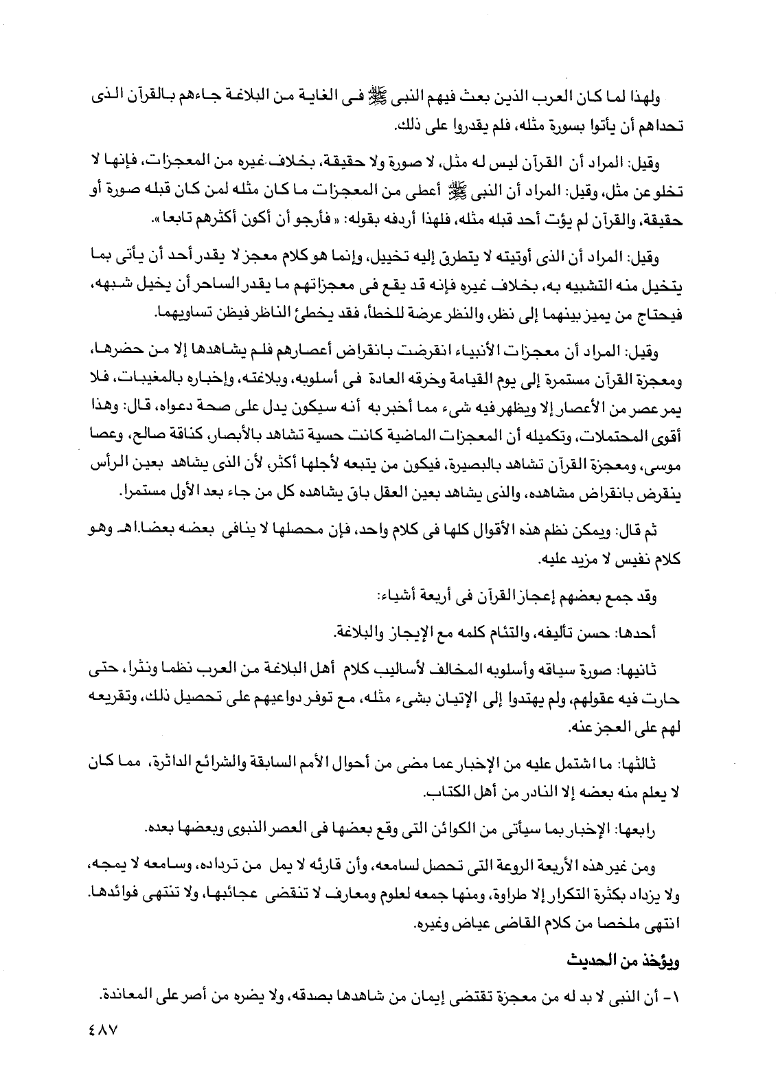 ومن غير هذه الأربعة الروعة التي تحصل لسامعه، وأن قارئه لا يمل من ترداده، وسامعه لا يمجه، ولا يزداد بكثرة التكرار إلا طراوة، ومنها جمعه لعلوم ومعارف لا تنقضي عجائبها، ولا تنتهي فوائدها. انتهى ملخصا من كلام القاضي عياض وغيره.