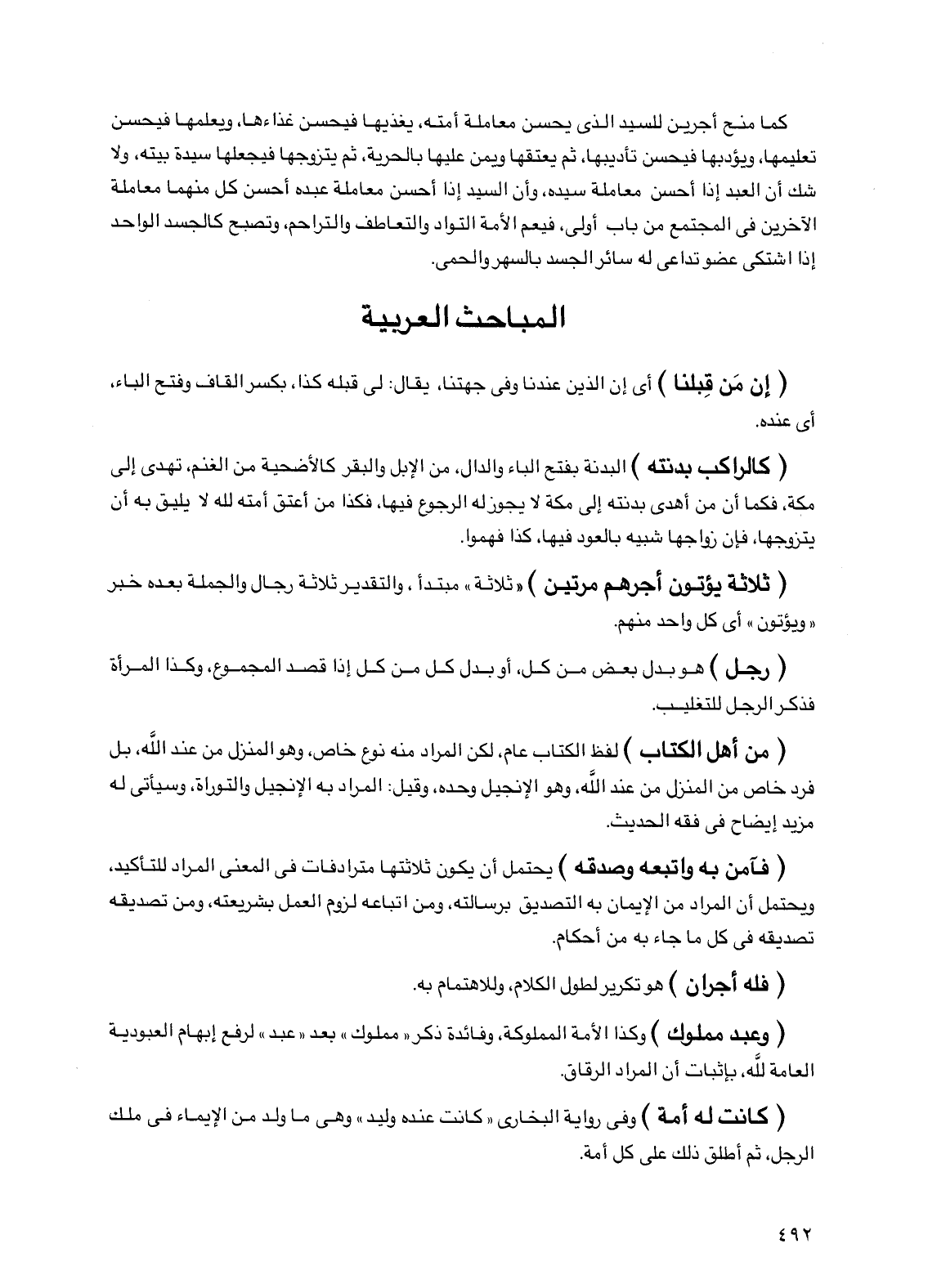 كما منح أجرين للسيد الذي يحسن معاملة أمته، يغذيها فيحسن غذاءها، ويعلمها فيحسن تعليمها، ويؤدبها فيحسن تأديبها، ثم يعتقها ويمن عليها بالحرية، ثم يتزوجها فيجعلها سيدة بيته، ولا شك أن العبد إذا أحسن معاملة سيده، وأن السيد إذا أحسن معاملة عبده أحسن كل منهما معاملة الآخرين في المجتمع من باب أولى، فيعم الأمة التواد والتعاطف والتراحم، وتصبح كالجسد الواحد إذا اشتكى عضو تداعى له سائر الجسد بالسهر والحمى.