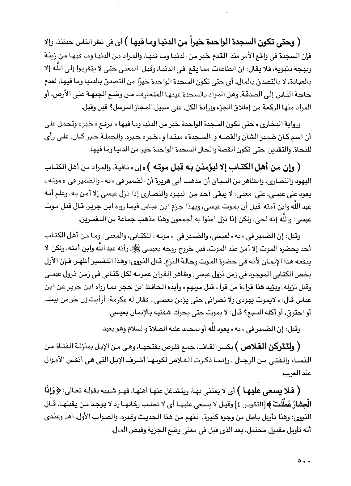 وقيل: إن الضمير في به لعيسى، والضمير في "موته" للكتابي، والمعنى: وما من أهل الكتاب أحد يحضره الموت إلا آمن عند الموت، قبل خروج روحه بعيسى صلى الله عليه وسلم وأنه عبد الله وابن أمته، ولكن لا ينفعه هذا الإيمان لأنه في حضرة الموت وحالة النزع. قال النووي: وهذا التفسير أظهر. فإن الأول يخص الكتابي الموجود في زمن نزول عيسى، وظاهر القرآن عمومه لكل كتابي في زمن نزول عيسى وقبل نزوله، ويؤيد هذا قراءة من قرأ "قبل موتهم" وأيده الحافظ ابن حجر بما رواه ابن جرير عن ابن عباس قال: "لا يموت يهودي ولا نصراني حتى يؤمن بعيسى"، فقال له عكرمة: أرأيت إن خر من بيت، أو احترق، أو أكله السبع؟ قال: لا يموت حتى يحرك شفتيه بالإيمان بعيسى.