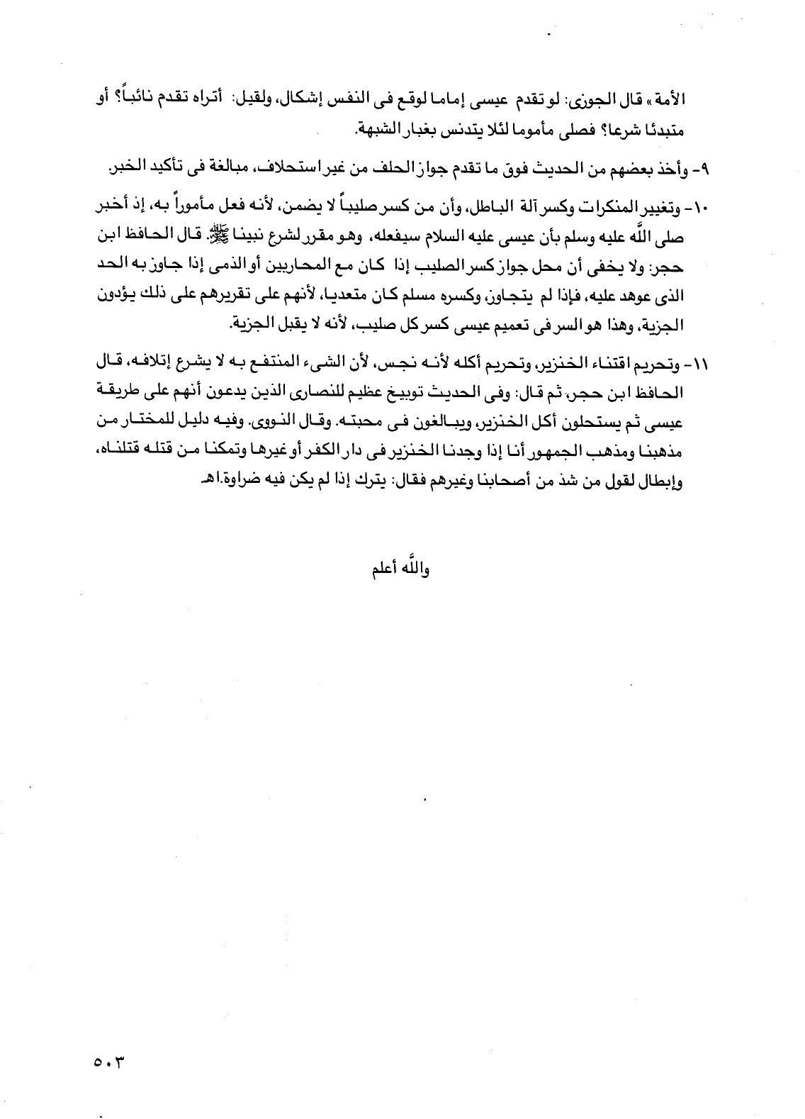 10 - وتغيير المنكرات وكسر آلة الباطل، وأن من كسر صليبا لا يضمن، لأنه فعل مأمورا به، إذ أخبر صلى الله عليه وسلم بأن عيسى عليه السلام سيفعله، وهو مقرر لشرع نبينا صلى الله عليه وسلم قال الحافظ ابن حجر: ولا يخفى أن محل جواز كسر الصليب إذا كان مع المحاربين أو الذمي إذا جاوز به الحد الذي عوهد عليه، فإذا لم يتجاوز، وكسره مسلم كان متعديا، لأنهم على تقريرهم على ذلك يؤدون الجزية، وهذا هو السر في تعميم عيسى كسر كل صليب، لأنه لا يقبل الجزية.