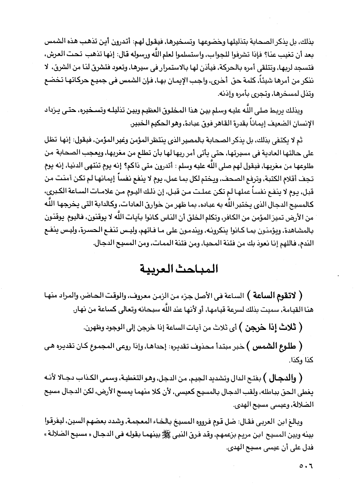 ثم لا يكتفي بذلك، بل يذكر الصحابة بالمصير الذي ينتظر المؤمن، وغير المؤمن، فيقول: إنها تظل على حالتها العادية في مسيرتها، حتى يأتي أمر ربها لها بأن تطلع من مغربها، ويعجب الصحابة من طلوعها من مغربها، فيقول لهم صلى الله عليه وسلم: أتدرون متى ذاكم؟ إنه يوم تنتهي الدنيا، إنه يوم تجف أقلام الكتبة، وترفع الصحف، ويختم لكل بما عمل، يوم لا ينفع نفسا إيمانها لم تكن آمنت من قبل، يوم لا ينفع نفسا عملها لم تكن عملت من قبل، إن ذلك اليوم من علامات الساعة الكبرى، كالمسيح الدجال الذي يختبر الله به عباده، بما ظهر من خوارق العادات، وكالدابة التي يخرجها الله من الأرض تميز المؤمن من الكافر، وتكلم الخلق أن الناس كانوا بآيات الله لا يوقنون، فاليوم يوقنون بالمشاهدة، ويؤمنون بما كانوا ينكرونه، ويندمون على ما فاتهم، وليس تنفع الحسرة، وليس ينفع الندم، فاللهم إنا نعوذ بك من فتنة المحيا، ومن فتنة الممات، ومن المسيح الدجال.