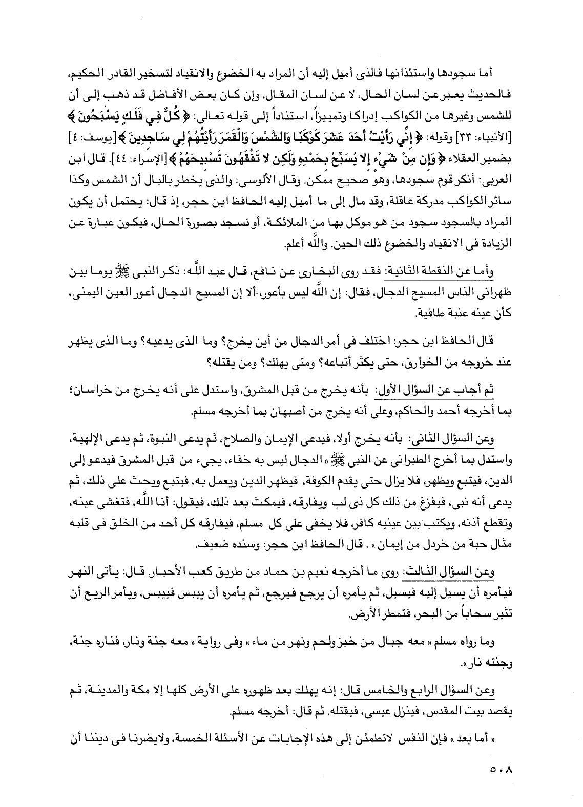 أما سجودها واستئذانها فالذي أميل إليه أن المراد به الخضوع والانقياد لتسخير القادر الحكيم، فالحديث يعبر عن لسان الحال، لا عن لسان المقال، وإن كان بعض الأفاضل قد ذهب إلى أن للشمس وغيرها من الكواكب إدراكا وتمييزا، استنادا إلى قوله تعالى: {كل في فلك يسبحون} [الأنبياء: 33] وقوله: {إني رأيت أحد عشر كوكبا والشمس والقمر رأيتهم لي ساجدين} [يوسف: 4] بضمير العقلاء {وإن من شيء إلا يسبح بحمده ولكن لا تفقهون تسبيحهم} [الإسراء: 44]. قال ابن العربي: أنكر قوم سجودها، وهو صحيح ممكن. وقال الألوسي: والذي يخطر بالبال أن الشمس وكذا سائر الكواكب مدركة عاقلة، وقد مال إلى ما أميل إليه الحافظ ابن حجر، إذ قال: يحتمل أن يكون المراد بالسجود سجود من هو موكل بها من الملائكة، أو تسجد بصورة الحال، فيكون عبارة عن الزيادة في الانقياد والخضوع ذلك الحين. والله أعلم.