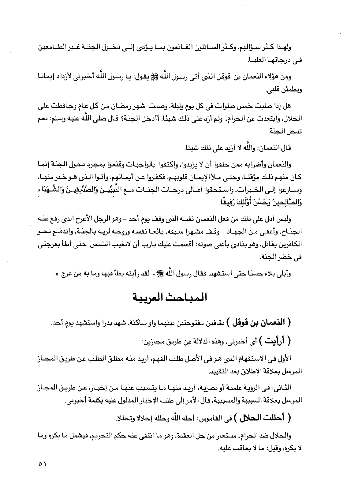 وليس أدل على ذلك من فعل النعمان نفسه الذي وقف يوم أحد - وهو الرجل الأعرج الذي رفع عنه الجناح، وأعفي من الجهاد- وقف مشهرا سيفه، بائعا نفسه وروحه لربه بالجنة، واندفع نحو الكافرين يقاتل، وهو ينادي بأعلى صوته: أقسمت عليك يا رب أن لا تغيب الشمس حتى أطأ بعرجتي في خضر الجنة.