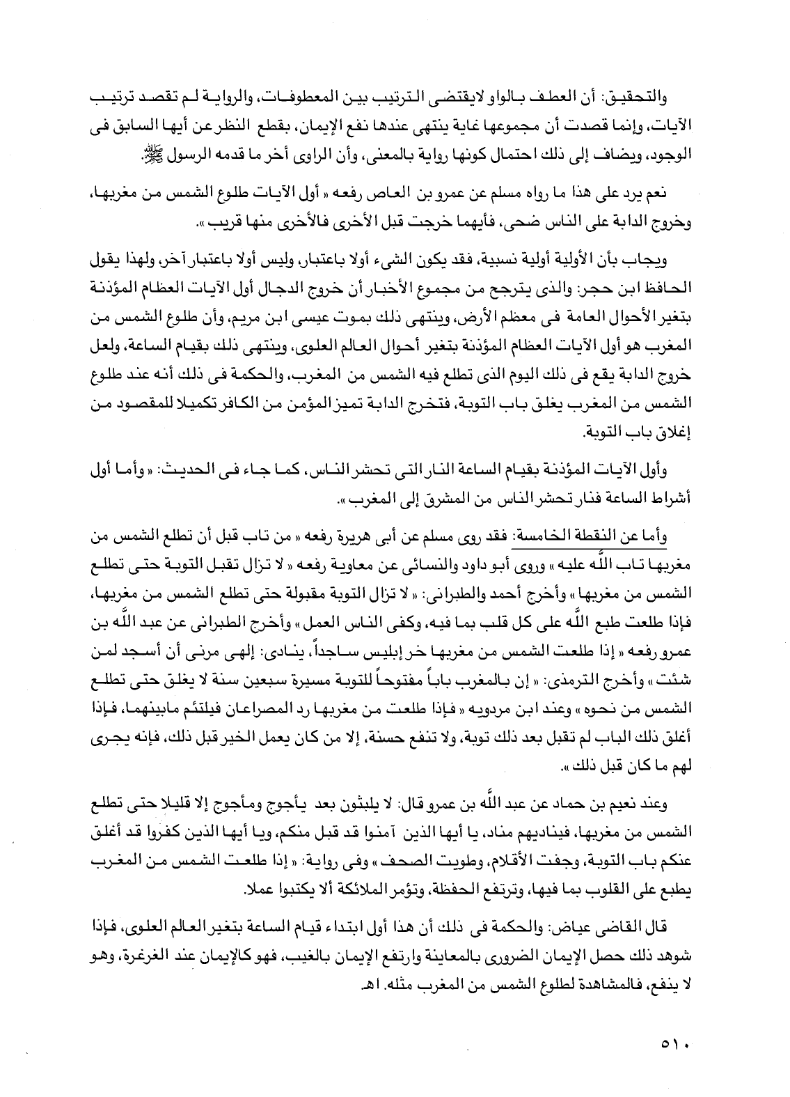 وأما عن النقطة الخامسة: فقد روى مسلم عن أبي هريرة رفعه "من تاب قبل أن تطلع الشمس من مغربها تاب الله عليه" وروى أبو داود والنسائي عن معاوية رفعه "لا تزال تقبل التوبة حتى تطلع الشمس من مغربها" وأخرج أحمد والطبراني: "لا تزال التوبة مقبولة حتى تطلع الشمس من مغربها، فإذا طلعت طبع الله على كل قلب بما فيه، وكفى الناس العمل" وأخرج الطبراني عن عبد الله بن عمرو رفعه "إذا طلعت الشمس من مغربها خر إبليس ساجدا، ينادي: إلهي مرني أن أسجد لمن شئت" وأخرج الترمذي: "إن بالمغرب بابا مفتوحا للتوبة مسيرة سبعين سنة لا يغلق حتى تطلع الشمس من نحوه" وعند ابن مردويه "فإذا طلعت من مغربها رد المصراعان فيلتئم ما بينهما، فإذا أغلق ذلك الباب لم تقبل بعد ذلك توبة، ولا تنفع حسنة، إلا من كان يعمل الخير قبل ذلك فإنه يجري لهم ما كان قبل ذلك".