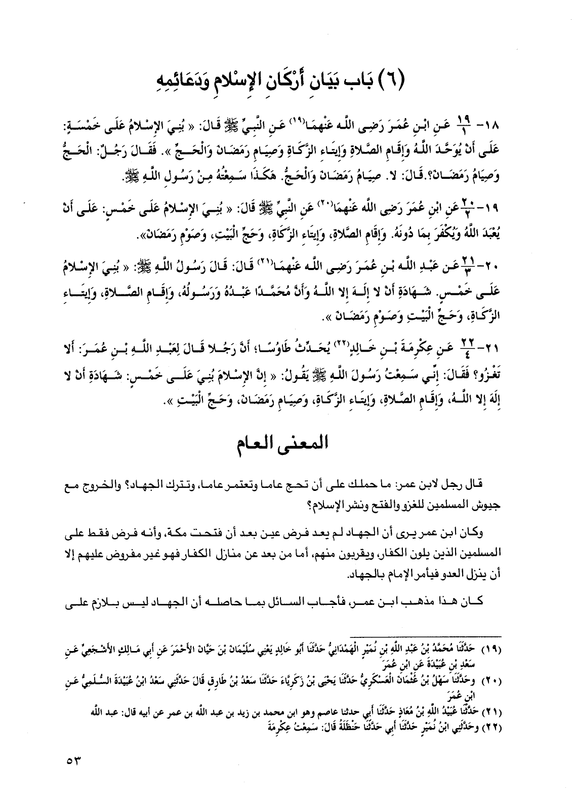 21 - عن عكرمة بن خالد يحدث طاوسا، أن رجلا قال لعبد الله بن عمر: ألا تغزو؟ فقال: إني سمعت رسول الله صلى الله عليه وسلم يقول: "إن الإسلام بني على خمس: شهادة أن لا إله إلا الله، وإقام الصلاة، وإيتاء الزكاة، وصيام رمضان، وحج البيت".