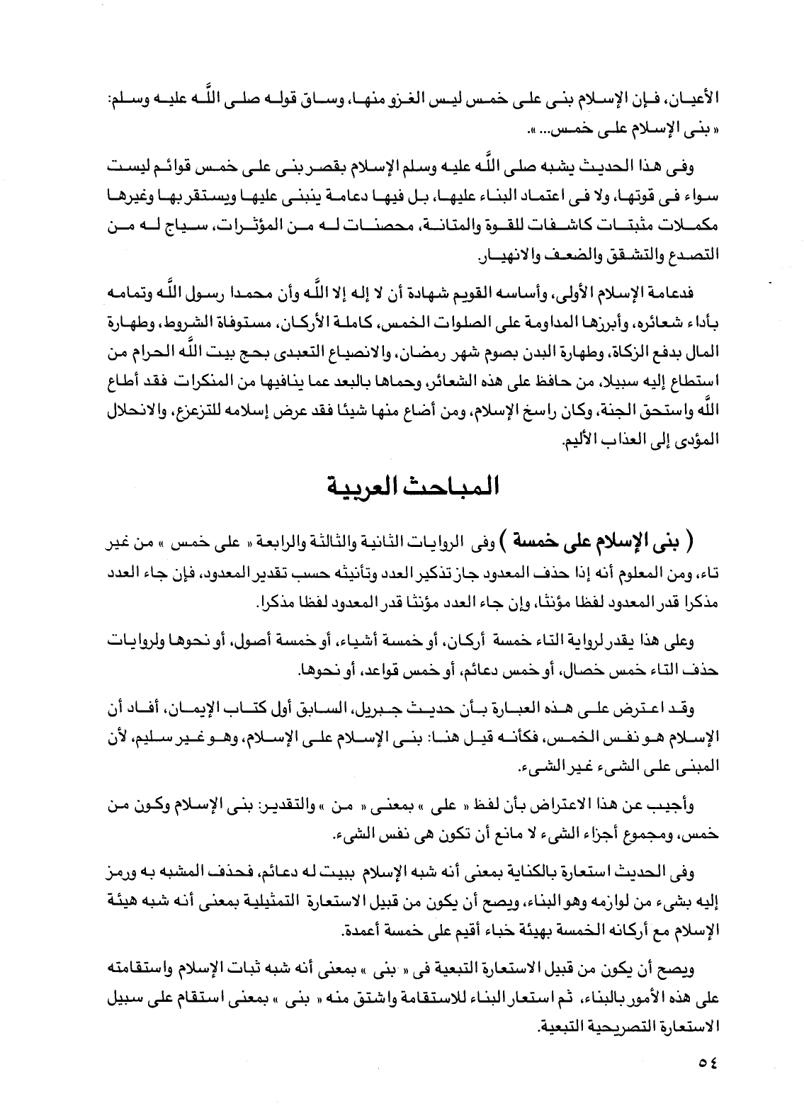 (بني الإسلام على خمسة) وفي الروايات الثانية والثالثة والرابعة "على خمس" من غير تاء ومن المعلوم أنه إذا حذف المعدود جاز تذكير العدد وتأنيثه حسب تقدير المعدود، فإن جاء العدد مذكرا قدر المعدود لفظا مؤنثا، وإن جاء العدد مؤنثا قدر المعدود لفظا مذكرا.