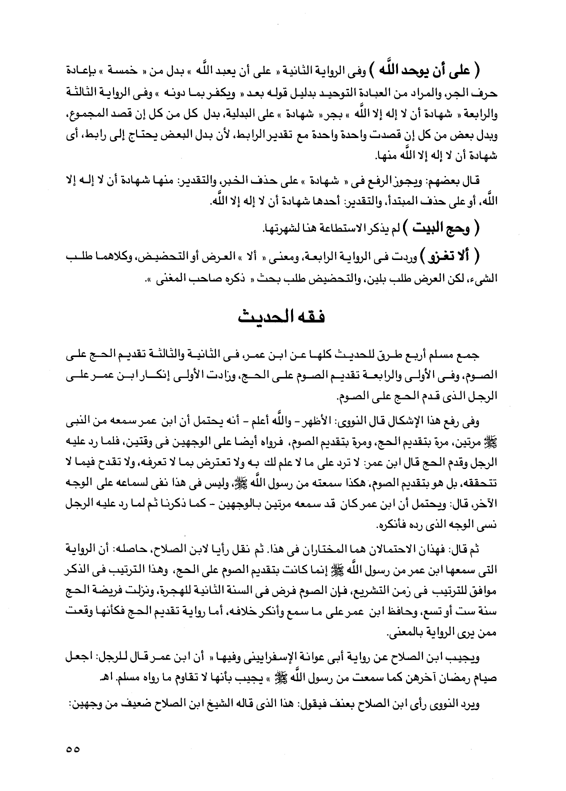 ثم قال: فهذان الاحتمالان هما المختاران في هذا. ثم نقل رأيا لابن الصلاح، حاصله: أن الرواية التي سمعها ابن عمر من رسول الله صلى الله عليه وسلم إنما كانت بتقديم الصوم على الحج، وهذا الترتيب في الذكر موافق للترتيب في زمن التشريع، فإن الصوم فرض في السنة الثانية للهجرة، ونزلت فريضة الحج سنة ست أو تسع، وحافظ ابن عمر على ما سمع وأنكر خلافه، أما رواية تقديم الحج فكأنها وقعت ممن يرى الرواية بالمعنى.
