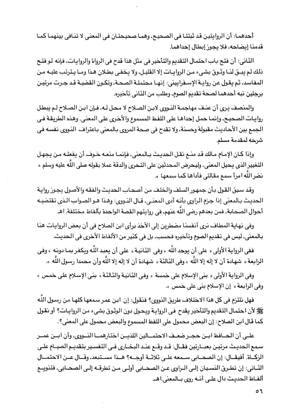 فهل نلتزم في كل هذا الاختلاف طريق النووي؟ فنقول: إن ابن عمر سمعها كلها من رسول الله صلى الله عليه وسلم لأن احتمال التقديم والتأخير يقدح في الرواية ويحول دون الوثوق بشيء من الروايات؟ أو نقول كما قال ابن الصلاح: إن البعض محمول على اللفظ المسموع والبعض محمول على المعنى؟ .