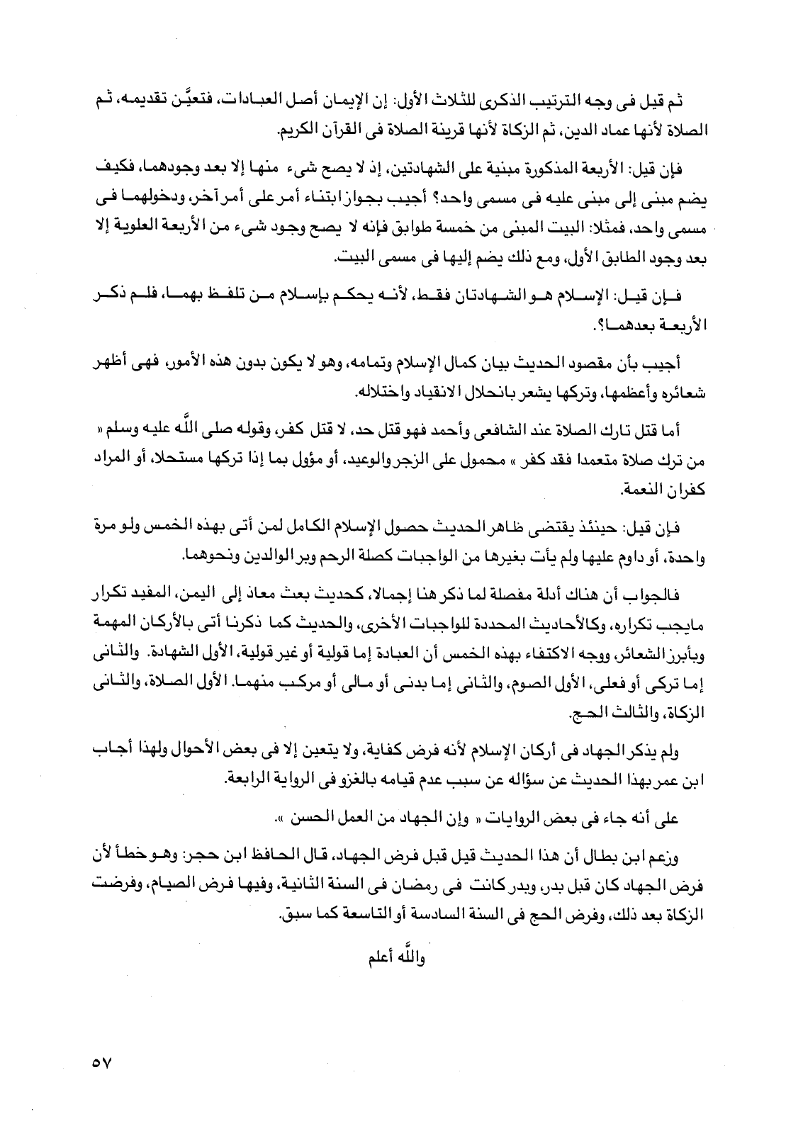 أجيب بأن مقصود الحديث بيان كمال الإسلام وتمامه، وهو لا يكون بدون هذه الأمور، فهي أظهر شعائره وأعظمها، وتركها يشعر بانحلال الانقياد واختلاله.