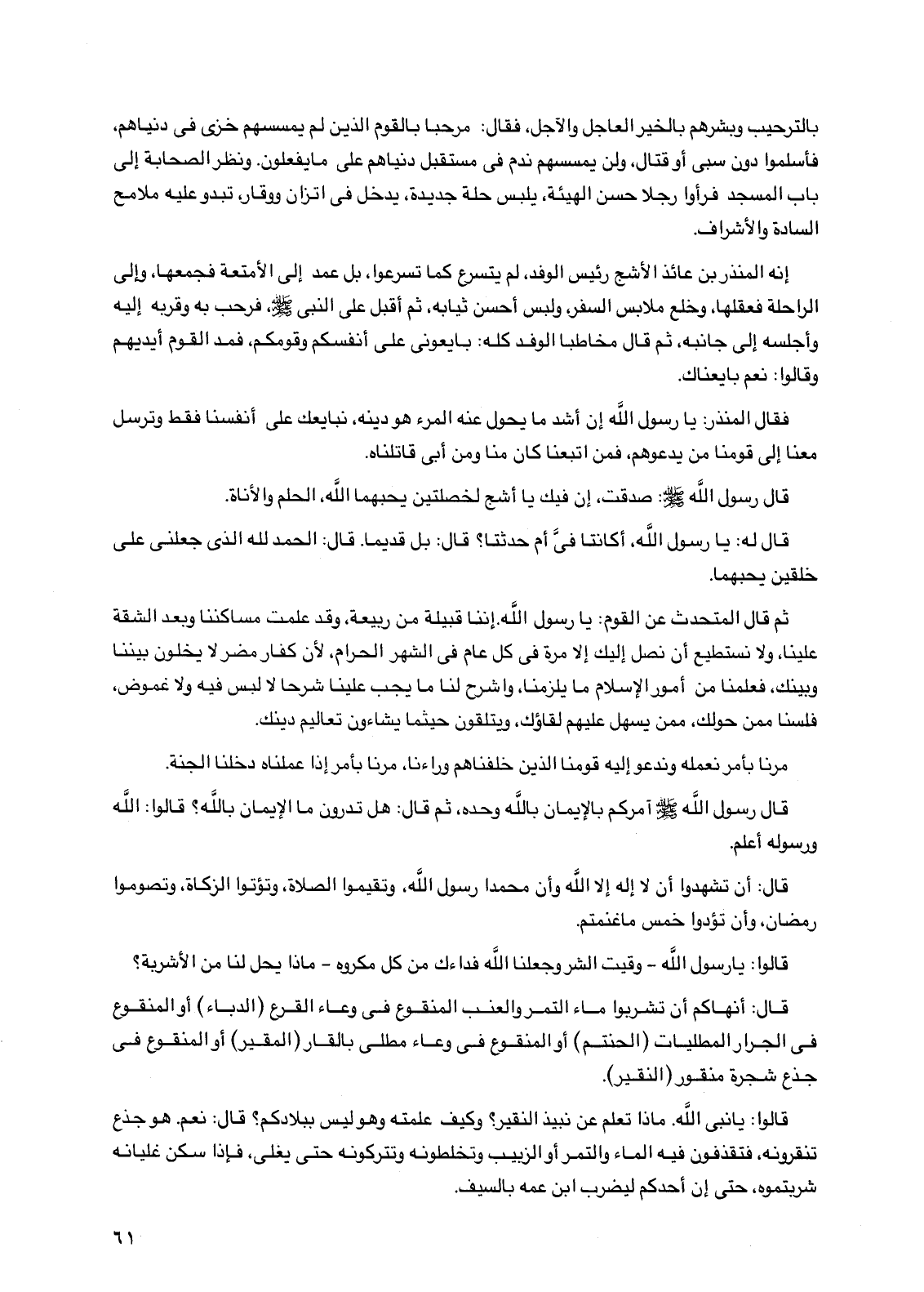 ثم قال المتحدث عن القوم: يا رسول الله. إننا قبيلة من ربيعة، وقد علمت مساكننا وبعد الشقة علينا، ولا نستطيع أن نصل إليك إلا مرة في كل عام في الشهر الحرام، لأن كفار مضر لا يخلون بيننا وبينك، فعلمنا من أمور الإسلام ما يلزمنا، واشرح لنا ما يجب علينا شرحا لا لبس فيه ولا غموض، فلسنا ممن حولك، ممن يسهل عليهم لقاؤك، ويتلقون حيثما يشاءون تعاليم دينك.