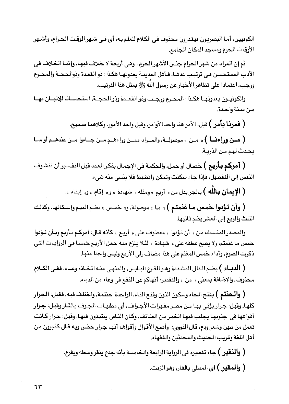 (والحنتم) بفتح الحاء وسكون النون وفتح التاء، الواحدة حنتمة، واختلف فيه، فقيل: الجرار كلها، وقيل: جرار يؤتى بها من مصر مقيرات الأجواف، أي مطليات الجوف بالقار وقيل: جرار أفواهها في جنوبها يجلب فيها الخمر من الطائف، وكان الناس ينتبذون فيها، وقيل: جرار كانت تعمل من طين وشعر ودم، قال النووي: وأصح الأقوال وأقواها أنها جرار خضر، وبه قال كثيرون من أهل اللغة وغريب الحديث والمحدثين والفقهاء.
