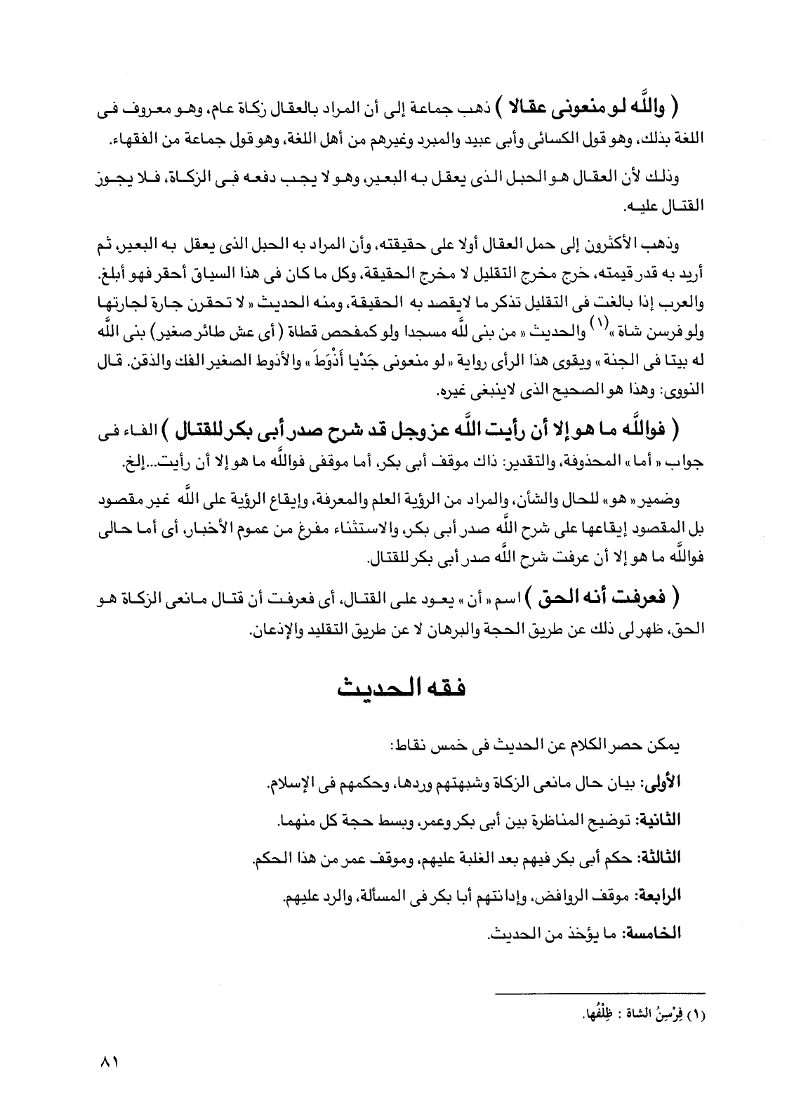 (والله لو منعوني عقالا) ذهب جماعة إلى أن المراد بالعقال زكاة عام، وهو معروف في اللغة بذلك، وهو قول الكسائي وأبي عبيد والمبرد وغيرهم من أهل اللغة، وهو قول جماعة من الفقهاء.