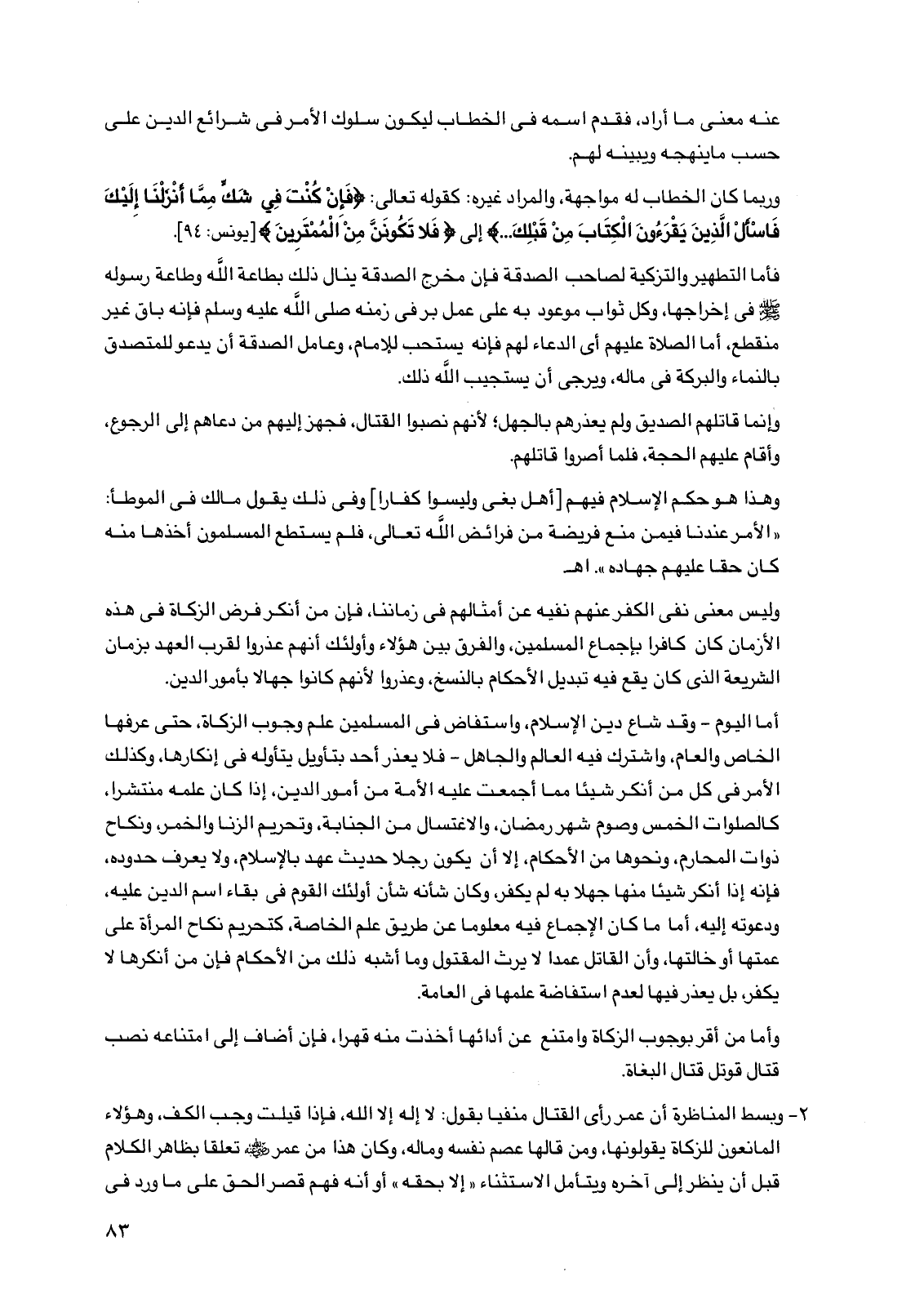 أما اليوم- وقد شاع دين الإسلام، واستفاض في المسلمين علم وجوب الزكاة، حتى عرفها الخاص والعام، واشترك فيه العالم والجاهل -فلا يعذر أحد بتأويل يتأوله في إنكارها، وكذلك الأمر في كل من أنكر شيئا مما أجمعت عليه الأمة من أمور الدين، إذا كان علمه منتشرا، كالصلوات الخمس وصوم شهر رمضان، والاغتسال من الجنابة، وتحريم الزنا والخمر، ونكاح ذوات المحارم، ونحوها من الأحكام، إلا أن يكون رجلا حديث عهد بالإسلام، ولا يعرف حدوده، فإنه إذا أنكر شيئا منها جهلا به لم يكفر، وكان شأنه شأن أولئك القوم في بقاء اسم الدين عليه، ودعوته إليه، أما ما كان الإجماع فيه معلوما عن طريق علم الخاصة، كتحريم نكاح المرأة على عمتها أو خالتها، وأن القاتل عمدا لا يرث المقتول وما أشبه ذلك من الأحكام فإن من أنكرها لا يكفر، بل يعذر فيها لعدم استفاضة علمها في العامة.