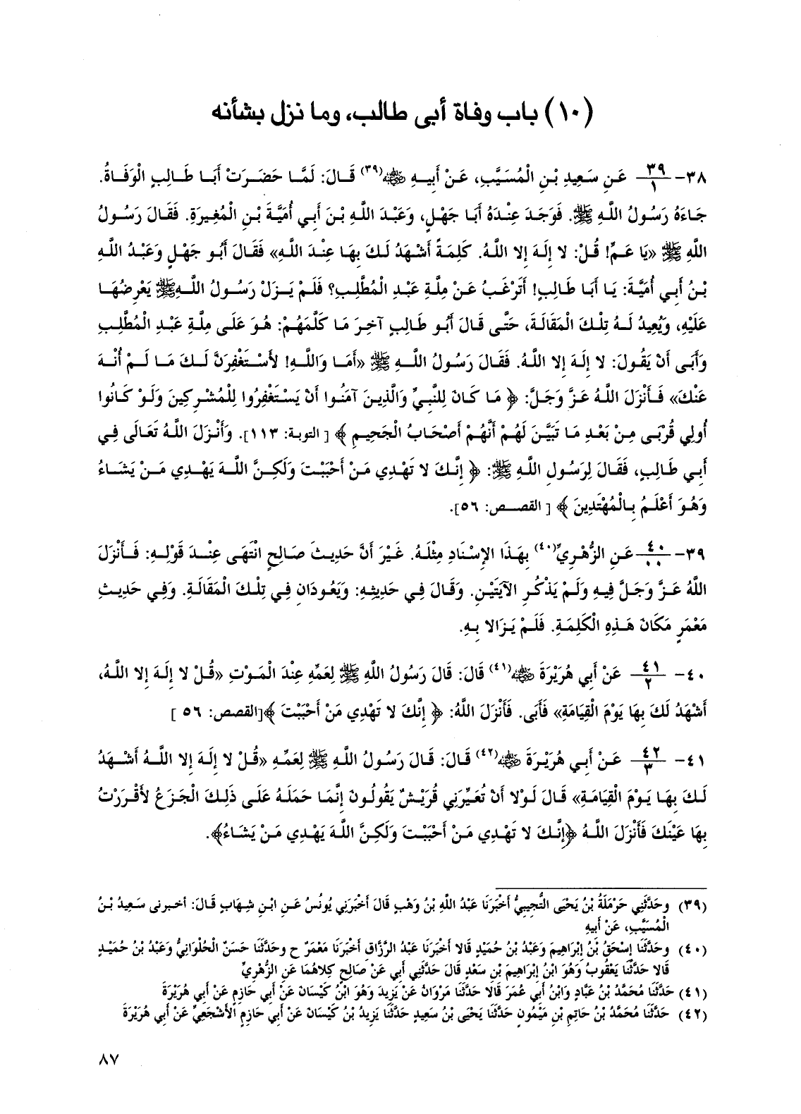 38 - عن سعيد بن المسيب، عن أبيه رضي الله عنه قال: لما حضرت أبا طالب الوفاة. جاءه رسول الله صلى الله عليه وسلم. فوجد عنده أبا جهل، وعبد الله بن أبي أمية بن المغيرة. فقال رسول الله صلى الله عليه وسلم "يا عم! قل: لا إله إلا الله. كلمة أشهد لك بها عند الله" فقال أبو جهل وعبد الله بن أبي أمية: يا أبا طالب! أترغب عن ملة عبد المطلب؟ فلم يزل رسول الله صلى الله عليه وسلم يعرضها عليه، ويعيد له تلك المقالة، حتى قال أبو طالب آخر ما كلمهم: هو على ملة عبد المطلب وأبى أن يقول: لا إله إلا الله. فقال رسول الله صلى الله عليه وسلم "أما والله! لأستغفرن لك ما لم أنه عنك" فأنزل الله عز وجل: {ما كان للنبي والذين آمنوا أن يستغفروا للمشركين ولو كانوا أولي قربى من بعد ما تبين لهم أنهم أصحاب الجحيم} [التوبة: 113]. وأنزل الله تعالى في أبي طالب، فقال لرسول الله صلى الله عليه وسلم: {إنك لا تهدي من أحببت ولكن الله يهدي من يشاء وهو أعلم بالمهتدين} [القصص: 56].