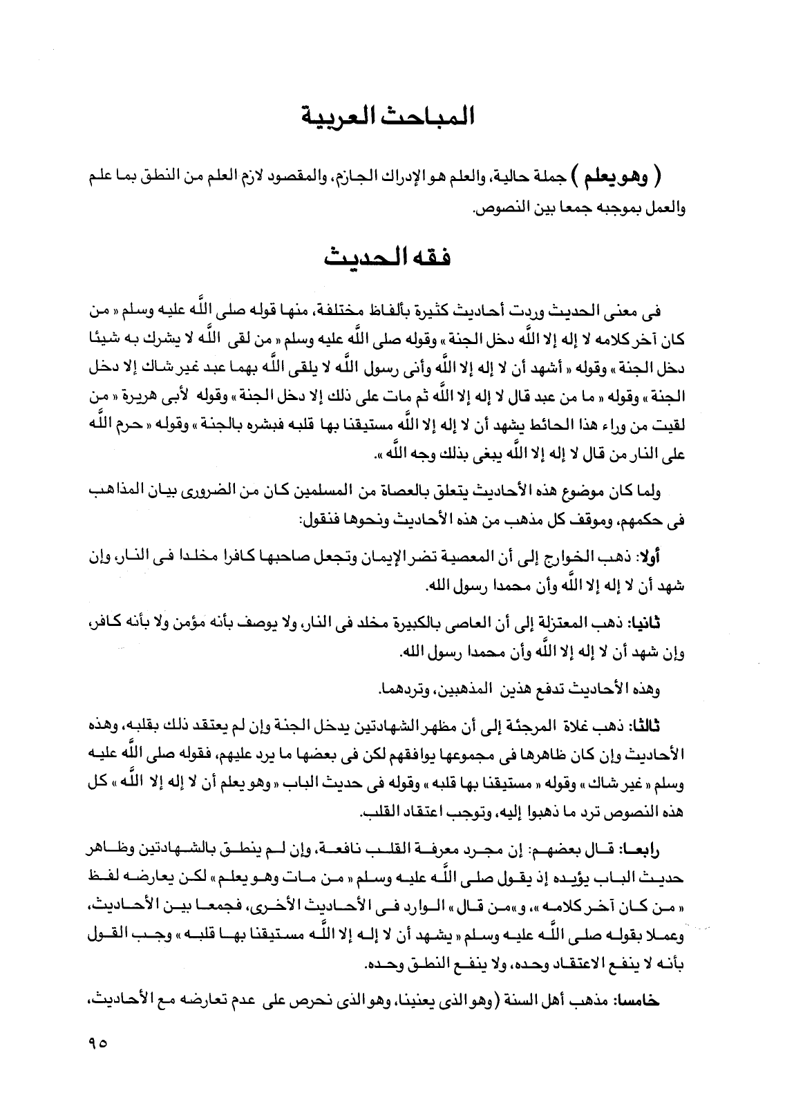 رابعا: قال بعضهم: إن مجرد معرفة القلب نافعة، وإن لم ينطق بالشهادتين وظاهر حديث الباب يؤيده إذ يقول صلى الله عليه وسلم "من مات وهو يعلم" لكن يعارضه لفظ "من كان آخر كلامه"، و"من قال" الوارد في الأحاديث الأخرى، فجمعا بين الأحاديث، وعملا بقوله صلى الله عليه وسلم "يشهد أن لا إله إلا الله مستيقنا بها قلبه" وجب القول بأ نه لا ينفع الاعتقاد وحده، ولا ينفع النطق وحده.