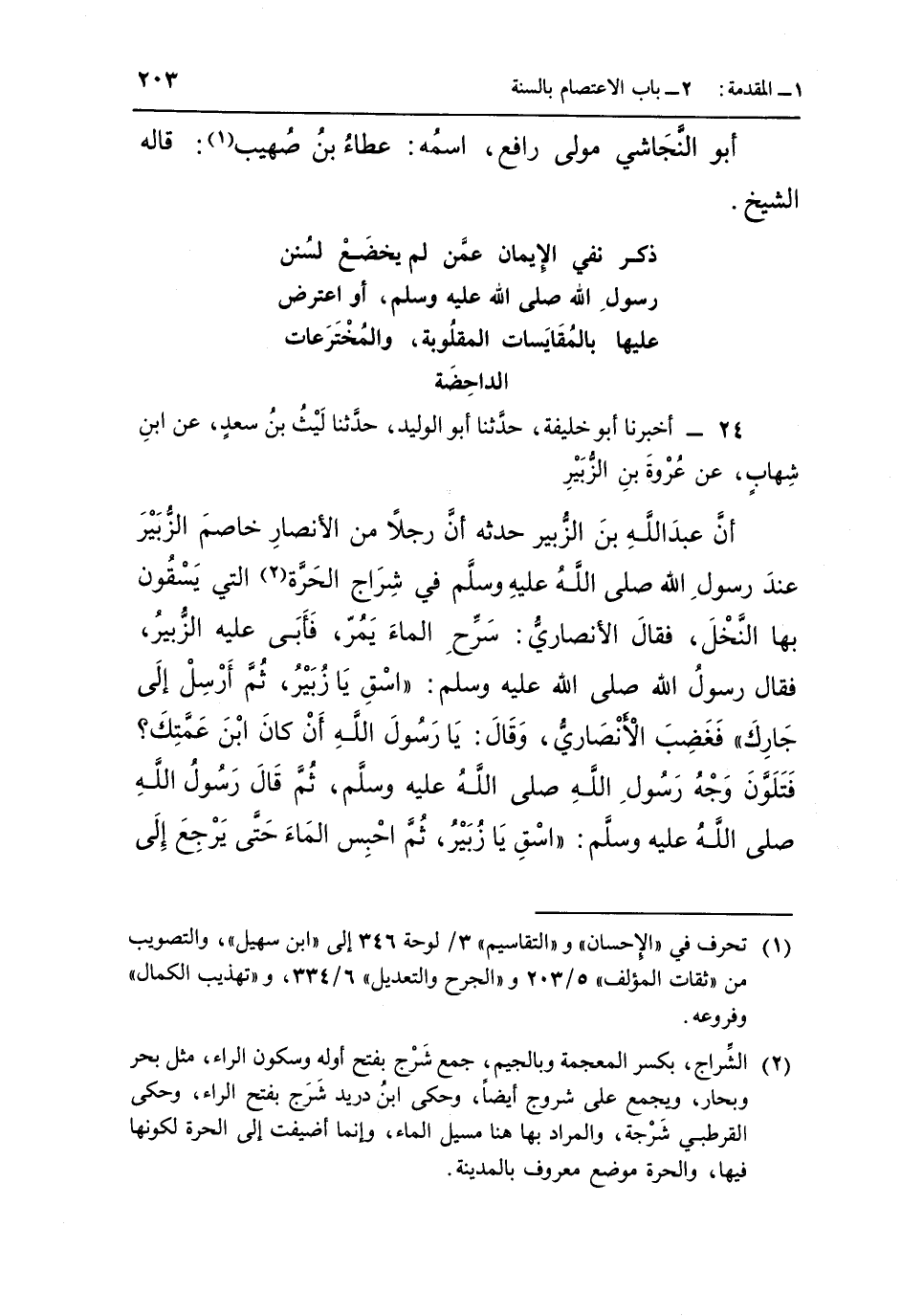 24 - أَخْبَرَنَا أَبُو خَلِيفَةَ حَدَّثَنَا أَبُو الْوَلِيدِ حَدَّثَنَا لَيْثُ بن سعد عن بن شِهَابٍ عَنْ عُرْوَةَ بْنِ الزُّبَيْرِ أَنَّ عَبْدَ اللَّهِ بْنَ الزُّبَيْرِ حَدَّثَهُ أَنَّ رَجُلًا مِنَ الْأَنْصَارِ خَاصَمَ الزُّبَيْرَ عِنْدَ رَسُولِ اللَّهِ صَلَّى اللَّهُ عَلَيْهِ وَسَلَّمَ فِي شِرَاجِ الْحَرَّةِ2 الَّتِي يَسْقُونَ بِهَا النَّخْلَ فَقَالَ الْأَنْصَارِيُّ سَرِّحِ الْمَاءَ يَمُرَّ فَأَبَى عَلَيْهِ الزُّبَيْرُ فَقَالَ رَسُولُ اللَّهِ صَلَّى اللَّهُ عَلَيْهِ وَسَلَّمَ: "اسْقِ يَا زُبَيْرُ ثُمَّ أَرْسِلْ إِلَى جَارِكَ" فَغَضِبَ الْأَنْصَارِيُّ وَقَالَ: يا رسول الله أن كان بن عَمَّتِكَ؟ فَتَلَوَّنَ وَجْهُ رَسُولِ اللَّهِ صَلَّى اللَّهُ عَلَيْهِ وَسَلَّمَ ثُمَّ قَالَ رَسُولُ اللَّهِ صَلَّى اللَّهُ عَلَيْهِ وَسَلَّمَ: "اسْقِ يَا زُبَيْرُ ثُمَّ احبس الماء حتى يرجع إلى