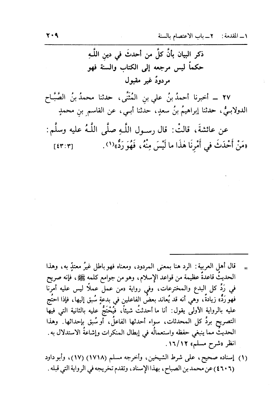 27 - أَخْبَرَنَا أَحْمَدُ بْنُ عَلِيِّ بْنِ الْمُثَنَّى حَدَّثَنَا مُحَمَّدُ بْنُ الصَّبَّاحِ الدُّولَابِيُّ حَدَّثَنَا إِبْرَاهِيمُ بْنُ سَعْدٍ حَدَّثَنَا أَبِي عَنِ الْقَاسِمِ بْنِ مُحَمَّدٍ. عَنْ عَائِشَةَ قَالَتْ: قَالَ رَسُولُ اللَّهِ صَلَّى اللَّهُ عَلَيْهِ وَسَلَّمَ: "مَنْ أَحْدَثَ فِي أَمْرِنَا هَذَا مَا ليس منه فهو رد"1. [43:3]