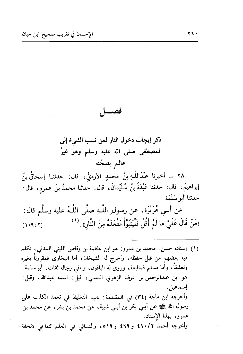 28 - أَخْبَرَنَا عَبْدُ اللَّهِ بْنُ مُحَمَّدٍ الْأَزْدِيُّ قَالَ حَدَّثَنَا إِسْحَاقُ بْنُ إِبْرَاهِيمَ قَالَ حَدَّثَنَا عَبْدَةُ بْنُ سُلَيْمَانَ قَالَ حَدَّثَنَا مُحَمَّدُ بْنُ عَمْرٍو قَالَ حَدَّثَنَا أَبُو سَلَمَةَ. عَنْ أَبِي هُرَيْرَةَ عَنْ رَسُولِ اللَّهِ صَلَّى اللَّهُ عَلَيْهِ وَسَلَّمَ قَالَ: "مَنْ قَالَ عَلَيَّ مَا لَمْ أَقُلْ فَلْيَتَبَوَّأْ مَقْعَدَهُ مِنَ النار"1. [109:2]