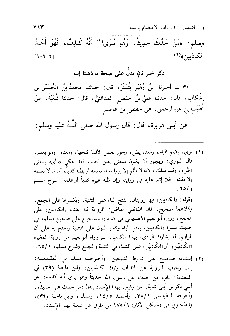وَسَلَّمَ: "مَنْ حَدَّثَ حَدِيثًا وَهُوَ يَرَى1 أَنَّهُ كذب فهو أحد الكاذبين"2. [109:2]