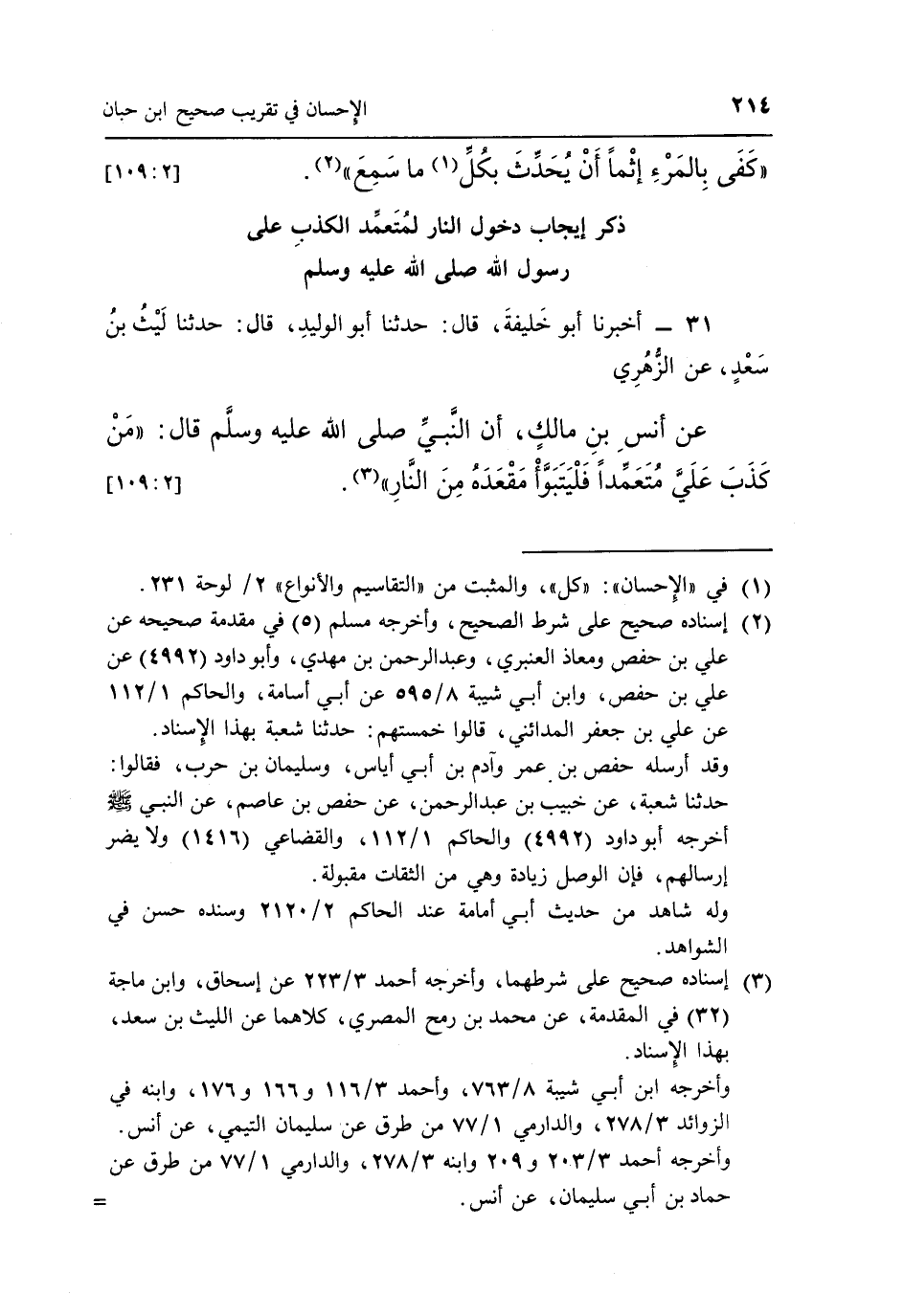 31 - أَخْبَرَنَا أَبُو خَلِيفَةَ قَالَ حَدَّثَنَا أَبُو الْوَلِيدِ قَالَ حَدَّثَنَا لَيْثُ بْنُ سَعْدٍ عَنِ الزُّهْرِيِّ عَنْ أَنَسِ بْنِ مَالِكٍ أَنَّ النَّبِيَّ صَلَّى اللَّهُ عَلَيْهِ وَسَلَّمَ قَالَ: "مَنْ كَذَبَ عَلَيَّ مُتَعَمِّدًا فَلْيَتَبَوَّأْ مَقْعَدَهُ مِنَ النَّارِ"1. [109:2]