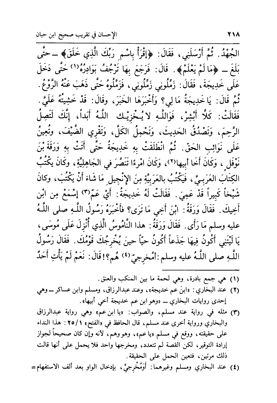 2 عند البخاري: "ابن عم خديجة" وعند عبد الرزاق، ومسلم وابن عساكر –وهي إحدى روايات البخاري- "وهو ابن عم خديجة أخي أبيها".