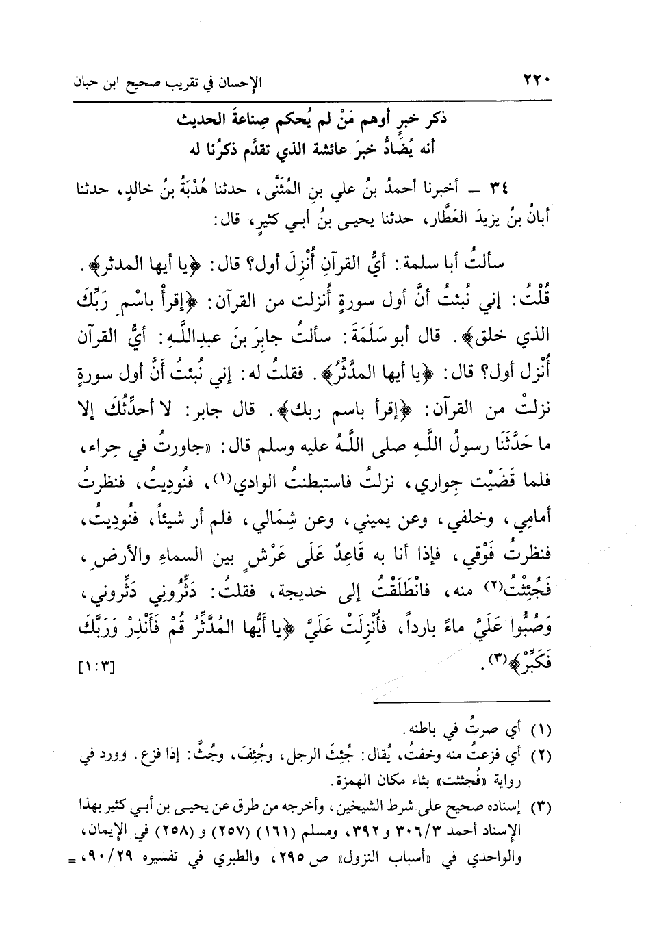 سَأَلْتُ أَبَا سَلَمَةَ أَيُّ الْقُرْآنِ أنزل أول قال: {يَا أَيُّهَا الْمُدَّثِّرُ} قُلْتُ: إِنِّي نُبِّئْتُ أَنَّ أَوَّلَ سُورَةٍ أُنْزِلَتْ مِنَ الْقُرْآنِ: {اقْرَأْ بِاسْمِ رَبِّكَ الَّذِي خَلَقَ} قَالَ أَبُو سَلَمَةَ: سَأَلْتُ جَابِرَ بْنَ عَبْدِ اللَّهِ أَيُّ الْقُرْآنِ أُنْزِلَ أَوَّلَ قَالَ: {يَا أَيُّهَا الْمُدَّثِّرُ} فَقُلْتُ لَهُ: إِنِّي نُبِّئْتُ أَنَّ أَوَّلَ سُورَةٍ نَزَلَتْ مِنَ الْقُرْآنِ: {اقْرَأْ بِاسْمِ رَبِّكَ} قَالَ جَابِرٌ: لاَ أُحَدِّثُكَ إِلاَّ مَا حَدَّثَنَا رَسُولُ اللَّهِ صَلَّى اللَّهُ عَلَيْهِ وَسَلَّمَ قال: "جَاوَرْتُ فِي حِرَاءَ فَلَمَّا قَضَيْتُ جِوَارِي نَزَلْتُ فَاسْتَبْطَنْتُ الْوَادِيَ1 فَنُودِيتُ فَنَظَرْتُ أَمَامِي وَخَلْفِي وَعَنْ يَمِينِي وَعَنْ شِمَالِي فَلَمْ أَرَ شَيْئًا فَنُودِيتُ فَنَظَرْتُ فَوْقِي فَإِذَا أَنَا بِهِ قَاعِدٌ عَلَى عَرْشٍ بَيْنَ السَّمَاءِ وَالْأَرْضِ فَجُئِثْتُ2مِنْهُ فَانْطَلَقْتُ إِلَى خَدِيجَةَ فَقُلْتُ دَثِّرُونِي دَثِّرُونِي وَصَبُّوا عَلَيَّ مَاءً بَارِدًا فَأُنْزِلَتْ عَلَيَّ {يَا أَيُّهَا الْمُدَّثِّرُ قُمْ فَأَنْذِرْ وَرَبَّكَ فَكَبِّرْ} " 3. [1:3]