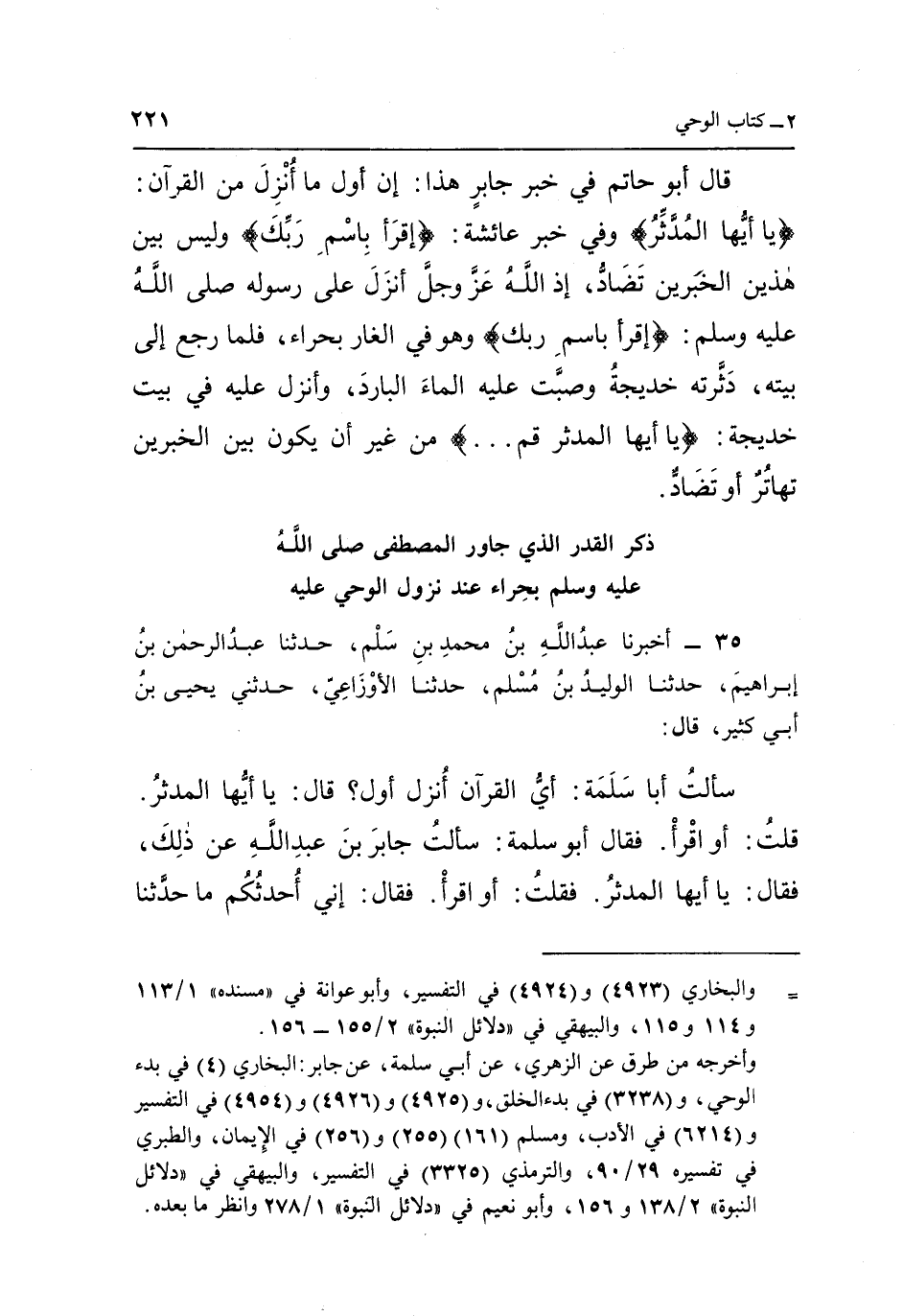 35 - أَخْبَرَنَا عَبْدُ اللَّهِ بْنُ مُحَمَّدِ بْنِ سَلْمٍ حَدَّثَنَا عَبْدُ الرَّحْمَنِ بْنُ إِبْرَاهِيمَ حَدَّثَنَا الْوَلِيدُ بْنُ مُسْلِمٍ حَدَّثَنَا الْأَوْزَاعِيُّ حَدَّثَنِي يَحْيَى بْنُ أَبِي كَثِيرٍ قَالَ: سَأَلْتُ أَبَا سَلَمَةَ: أَيُّ الْقُرْآنِ أُنْزِلَ أَوَّلَ؟ قَالَ: "يَا أَيُّهَا الْمُدَّثِّرُ" قلت: أو "اقرأ"؟ فَقَالَ أَبُو سَلَمَةَ: سَأَلْتُ جَابِرَ بْنَ عَبْدِ اللَّهِ عَنْ ذَلِكَ فَقَالَ: "يَا أَيُّهَا الْمُدَّثِّرُ" فقلت أو "اقرأ"؟ فقال: إني أحدثكم ما حدثناذكر الْقَدْرِ الَّذِي جَاوَرَ الْمُصْطَفَى صَلَّى اللَّهُ عَلَيْهِ وَسَلَّمَ بِحِرَاءَ عِنْدَ نُزُولِ الْوَحْيِ عَلَيْهِ