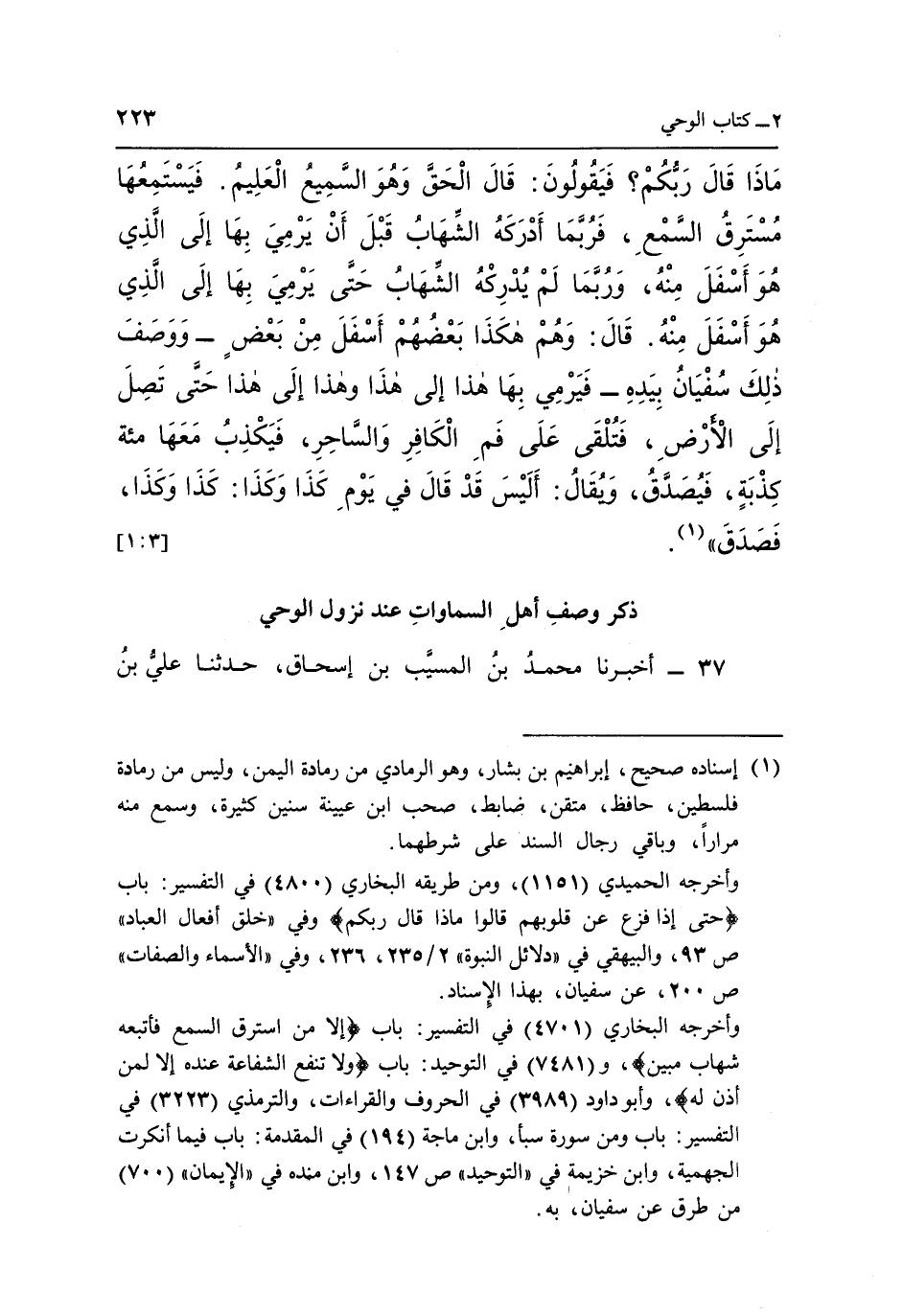 مَاذَا قَالَ رَبُّكُمْ؟ فَيَقُولُونَ: قَالَ الْحَقَّ وَهُوَ السَّمِيعُ الْعَلِيمُ. فَيَسْتَمِعُهَا مُسْتَرِقُ السَّمْعِ فَرُبَّمَا أَدْرَكَهُ الشِّهَابُ قَبْلَ أَنْ يَرْمِيَ بِهَا إِلَى الَّذِي هُوَ أَسْفَلُ مِنْهُ وَرُبَّمَا لَمْ يُدْرِكْهُ الشِّهَابُ حَتَّى يَرْمِيَ بِهَا إِلَى الَّذِي هُوَ أَسْفَلُ مِنْهُ قَالَ وَهُمْ هَكَذَا بَعْضُهُمْ أَسْفَلُ مِنْ بَعْضٍ وَوَصَفَ ذَلِكَ سُفْيَانُ بِيَدِهِ فَيَرْمِي بِهَا هَذَا إِلَى هَذَا وَهَذَا إِلَى هَذَا حَتَّى تَصِلَ إِلَى الْأَرْضِ فَتُلْقَى عَلَى فَمِ الْكَافِرِ وَالسَّاحِرِ فَيَكْذِبُ مَعَهَا مِائَةَ كِذْبَةٍ فَيُصَدَّقُ وَيُقَالُ أَلَيْسَ قَدْ قَالَ فِي يَوْمِ كَذَا وَكَذَا كذا وكذا فصدق"1. [1:3]