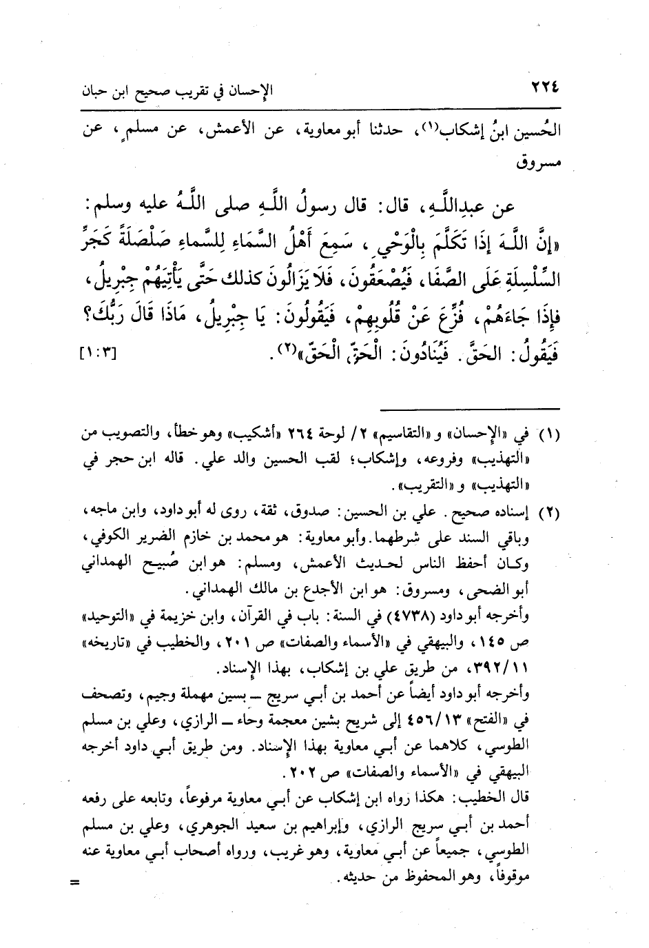 37 - أَخْبَرَنَا مُحَمَّدُ بْنُ الْمُسَيَّبِ بْنِ إِسْحَاقَ حَدَّثَنَا عَلِيُّ بْنُ الْحُسَيْنِ بْنِ إِشْكَابٍ1 حَدَّثَنَا أَبُو مُعَاوِيَةَ عَنِ الْأَعْمَشِ عَنْ مُسْلِمٍ عَنْ مَسْرُوقٍ. عَنْ عَبْدِ اللَّهِ قَالَ قَالَ رَسُولُ اللَّهِ صَلَّى اللَّهُ عَلَيْهِ وَسَلَّمَ: "إِنَّ اللَّهَ إِذَا تَكَلَّمَ بِالْوَحْيِ سَمِعَ أَهْلُ السَّمَاءِ لِلسَّمَاءِ صَلْصَلَةً كَجَرِّ السِّلْسِلَةِ عَلَى الصَّفَا فَيُصْعَقُونَ فَلَا يَزَالُونَ كَذَلِكَ حَتَّى يَأْتِيَهُمْ جِبْرِيلُ فَإِذَا جَاءَهُمْ فُزِّعَ عَنْ قُلُوبِهِمْ فَيَقُولُونَ يَا جِبْرِيلُ مَاذَا قَالَ ربك فيقول الحق فينادون الحق الحق"2. [1:3]
