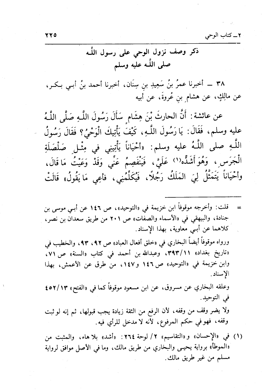 38 - أَخْبَرَنَا عُمَرُ بْنُ سَعِيدِ بْنِ سِنَانٍ أَخْبَرَنَا أَحْمَدُ بْنُ أَبِي بَكْرٍ عَنْ مَالِكٍ عَنْ هِشَامِ بْنِ عُرْوَةَ عَنْ أَبِيهِ عَنْ عَائِشَةَ أَنَّ الْحَارِثَ بْنَ هِشَامٍ سَأَلَ رَسُولَ اللَّهِ صَلَّى اللَّهُ عَلَيْهِ وَسَلَّمَ فَقَالَ يَا رَسُولَ اللَّهِ كَيْفَ يَأْتِيكَ الْوَحْيُ فَقَالَ رَسُولُ اللَّهِ صَلَّى اللَّهُ عَلَيْهِ وَسَلَّمَ: "أَحْيَانًا يَأْتِينِي فِي مِثْلِ صَلْصَلَةِ الْجَرَسِ وَهُوَ أَشَدُّهُ1 عَلَيَّ فَيَنْفَصِمُ عَنِّي وَقَدْ وَعَيْتُ مَا قَالَ وَأَحْيَانًا يَتَمَثَّلُ لِيَ الْمَلَكُ رَجُلًا فيكلمني فأعي ما يقول" قالت