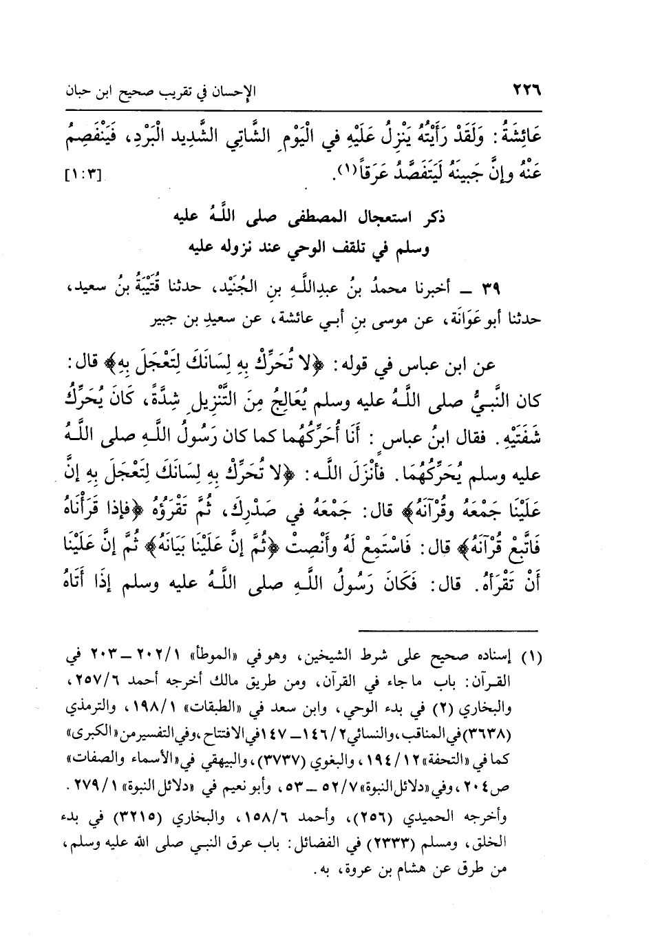 39 - أَخْبَرَنَا مُحَمَّدُ بْنُ عَبْدِ اللَّهِ بْنِ الْجُنَيْدِ حَدَّثَنَا قُتَيْبَةُ بْنُ سَعِيدٍ حَدَّثَنَا أَبُو عَوَانَةَ عَنْ مُوسَى بْنِ أَبِي عَائِشَةَ عَنْ سَعِيدِ بْنِ جُبَيْرٍ. عَنِ ابْنِ عَبَّاسٍ فِي قَوْلِهِ: {لَا تُحَرِّكْ بِهِ لِسَانَكَ لِتَعْجَلَ بِهِ} قَالَ: كَانَ النَّبِيُّ صَلَّى اللَّهُ عَلَيْهِ وَسَلَّمَ يُعَالِجُ مِنَ التَّنْزِيلِ شِدَّةً كَانَ يُحَرِّكُ شَفَتَيْهِ فَقَالَ ابْنُ عَبَّاسٍ أَنَا أُحَرِّكُهُمَا كَمَا كَانَ رَسُولُ اللَّهِ صَلَّى اللَّهُ عَلَيْهِ وَسَلَّمَ يُحَرِّكُهُمَا فَأَنْزَلَ اللَّهُ {لَا تُحَرِّكْ بِهِ لِسَانَكَ لِتَعْجَلَ بِهِ إِنَّ عَلَيْنَا جَمْعَهُ وَقُرْآنَهُ} قَالَ: جَمْعُهُ فِي صَدْرِكَ ثُمَّ تَقْرَؤُهُ {فَإِذَا قَرَأْنَاهُ فَاتَّبِعْ قُرْآنَهُ} قَالَ فَاسْتَمِعْ لَهُ وَأَنْصِتْ {ثُمَّ إِنَّ عَلَيْنَا بَيَانَهُ} ثُمَّ إِنَّ عَلَيْنَا أَنْ تَقْرَأَهُ قَالَ: فَكَانَ رَسُولُ اللَّهِ صَلَّى اللَّهُ عَلَيْهِ وَسَلَّمَ إِذَا أتاهذكر اسْتِعْجَالِ الْمُصْطَفَى صَلَّى اللَّهُ عَلَيْهِ وَسَلَّمَ فِي تَلَقُّفِ الْوَحْيِ عِنْدَ نُزُولِهِ عَلَيْهِ