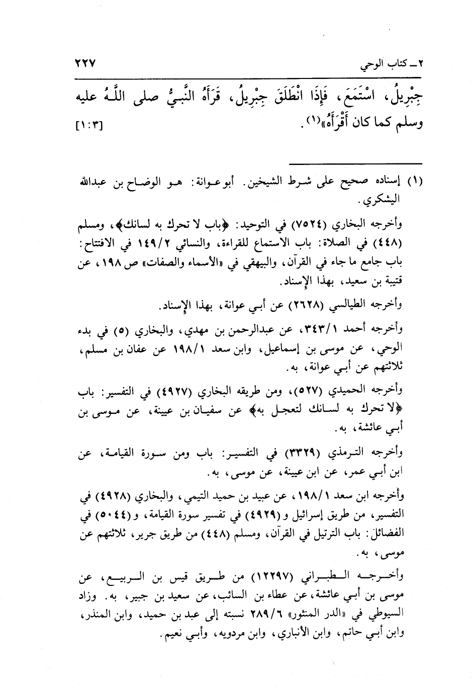 وأخرجه أحمد 1/343، عن عبد الرحمن بن مهدي، والبخاري "5" في بدء الوحي عن موسى بن إسماعيل، وابن سعد 1/198 عن عفان بن مسلم، ثلاثتهم عن أبي عوانة، به. وأخرجه الحميدي "527"، ومن طريقه البخاري "4927" في التفسير: باب {لا تُحَرِّكْ بِهِ لِسَانَكَ لِتَعْجَلَ بِهِ} "القيامة:16" عن سفيان بن عيينة، عن موسى بن أبي عائشة، به.