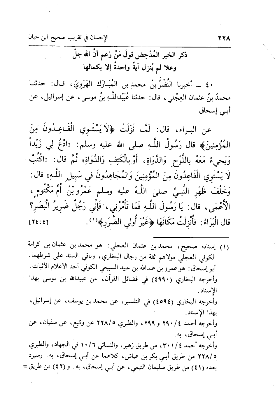 40 - أَخْبَرَنَا النَّضْرُ بْنُ مُحَمَّدِ بْنِ الْمُبَارَكِ الْهَرَوِيُّ قَالَ حَدَّثَنَا مُحَمَّدُ بْنُ عُثْمَانَ الْعِجْلِيُّ قَالَ حَدَّثَنَا عُبَيْدُ اللَّهِ بْنُ مُوسَى عَنْ إِسْرَائِيلَ عَنْ أَبِي إِسْحَاقَ. عَنِ الْبَرَاءِ قَالَ لَمَّا نَزَلَتْ {لَا يَسْتَوِي الْقَاعِدُونَ مِنَ الْمُؤْمِنِينَ} قَالَ رَسُولُ اللَّهِ صَلَّى اللَّهُ عَلَيْهِ وَسَلَّمَ: "ادْعُ لِي زَيْدًا وَيَجِيءُ مَعَهُ بِاللَّوْحِ وَالدَّوَاةِ أَوْ بِالْكَتِفِ وَالدَّوَاةِ" ثُمَّ قَالَ: "اكْتُبْ لَا يَسْتَوِي الْقَاعِدُونَ مِنَ الْمُؤْمِنِينَ وَالْمُجَاهِدُونَ فِي سَبِيلِ اللَّهِ" قَالَ: وَخَلْفَ ظَهْرِ النَّبِيِّ صَلَّى اللَّهُ عَلَيْهِ وَسَلَّمَ عَمْرُو بْنُ أُمِّ مَكْتُومٍ الْأَعْمَى قَالَ: يَا رَسُولَ اللَّهِ فَمَا تَأْمُرُنِي فَإِنِّي رَجُلٌ ضَرِيرُ الْبَصَرِ؟ قَالَ الْبَرَاءُ: فَأُنْزِلَتْ مَكَانَهَا: {غَيْرُ أُولِي الضَّرَرِ} 1. [24:4]