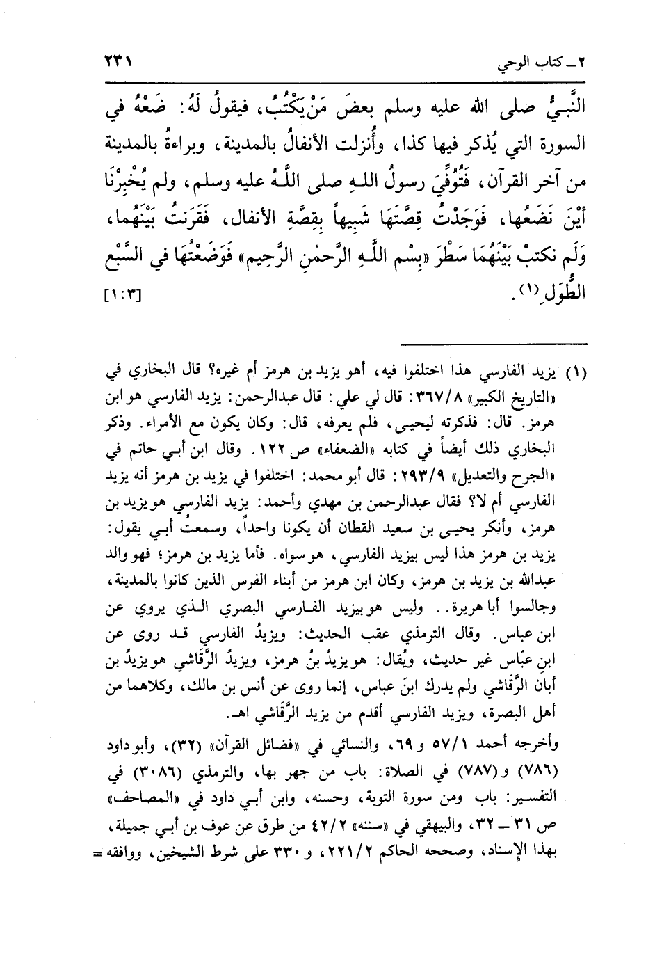 43 - أَخْبَرَنَا أَبُو خَلِيفَةَ حَدَّثَنَا عُثْمَانُ بْنُ الْهَيْثَمِ الْمُؤَذِّنُ حَدَّثَنَا عَوْفُ بْنُ أَبِي جَمِيلَةَ عَنْ يَزِيدَ الْفَارِسِيِّ قَالَ: قَالَ ابْنُ عَبَّاسٍ قُلْتُ لِعُثْمَانَ بْنِ عَفَّانَ: مَا حَمَلَكُمْ عَلَى أَنْ قَرَنْتُمْ بين الأنفال وبراءة وبراءة مِنَ الْمِئِينَ وَالْأَنْفَالُ مِنَ الْمَثَانِي فَقَرَنْتُمْ بَيْنَهُمَا فَقَالَ عُثْمَانُ: كَانَ إِذَا نَزَلَتْ مِنَ الْقُرْآنِ الْآيَةُ دَعَا النَّبِيُّ صَلَّى اللَّهُ عَلَيْهِ وَسَلَّمَ بعض من يكتب فيقولله: "ضَعْهُ فِي السُّورَةِ الَّتِي يُذْكَرُ فِيهَا كَذَا" وَأُنْزِلَتِ الْأَنْفَالُ بِالْمَدِينَةِ وَبَرَاءَةُ بِالْمَدِينَةِ مِنْ آخِرِ الْقُرْآنِ فَتُوُفِّيَ رَسُولُ اللَّهِ صَلَّى اللَّهُ عَلَيْهِ وَسَلَّمَ وَلَمْ يُخْبِرْنَا أَيْنَ نَضَعُهَا فَوَجَدْتُ قِصَّتَهَا شَبِيهًا بِقِصَّةِ الْأَنْفَالِ فَقَرَنْتُ بَيْنَهُمَا وَلَمْ نَكْتُبْ بَيْنَهُمَا سَطْرَ "بِسْمِ اللَّهِ الرَّحْمَنِ الرَّحِيمِ" فَوَضَعْتُهَا في السبع الطول1. [1:3]