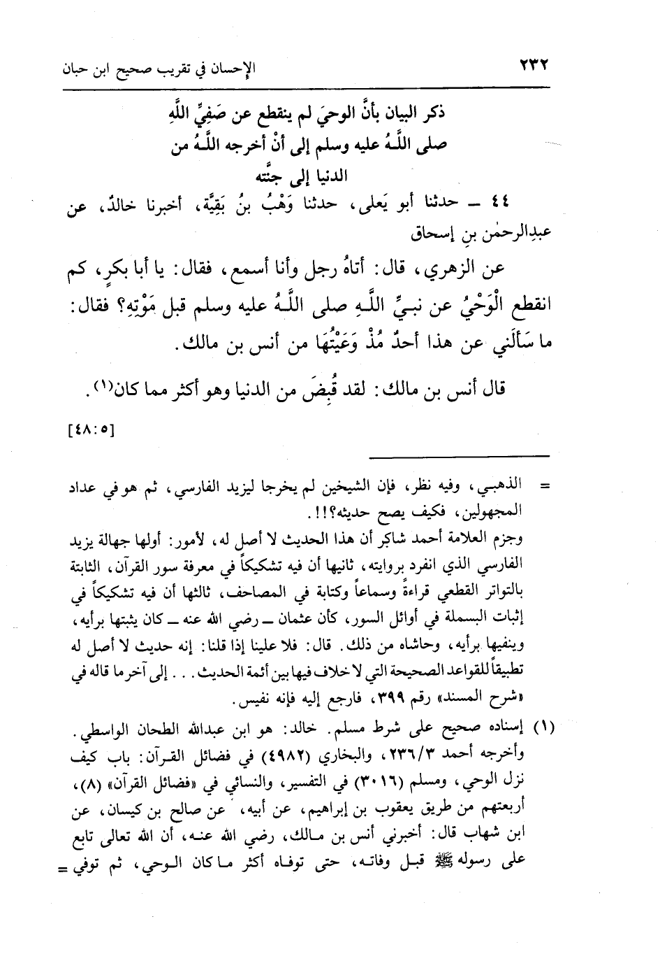 44 - حَدَّثَنَا أَبُو يَعْلَى حَدَّثَنَا وَهْبُ بْنُ بَقِيَّةَ أَخْبَرَنَا خَالِدٌ عَنْ عَبْدِ الرَّحْمَنِ بْنِ إِسْحَاقَ عَنِ الزُّهْرِيِّ قَالَ أَتَاهُ رَجُلٌ وَأَنَا أَسْمَعُ فَقَالَ يَا أَبَا بَكْرٍ كَمِ انْقَطَعَ الْوَحْيُ عَنْ نَبِيِّ اللَّهِ صَلَّى اللَّهُ عَلَيْهِ وَسَلَّمَ قَبْلَ مَوْتِهِ فَقَالَ مَا سَأَلَنِي عَنْ هَذَا أَحَدٌ مُذْ وَعَيْتُهَا مِنْ أَنَسِ بْنِ مَالِكٍ قَالَ أَنَسُ بْنُ مَالِكٍ: لَقَدْ قُبِضَ مِنَ الدنيا وهو أكثر مما كان1. [48:5]