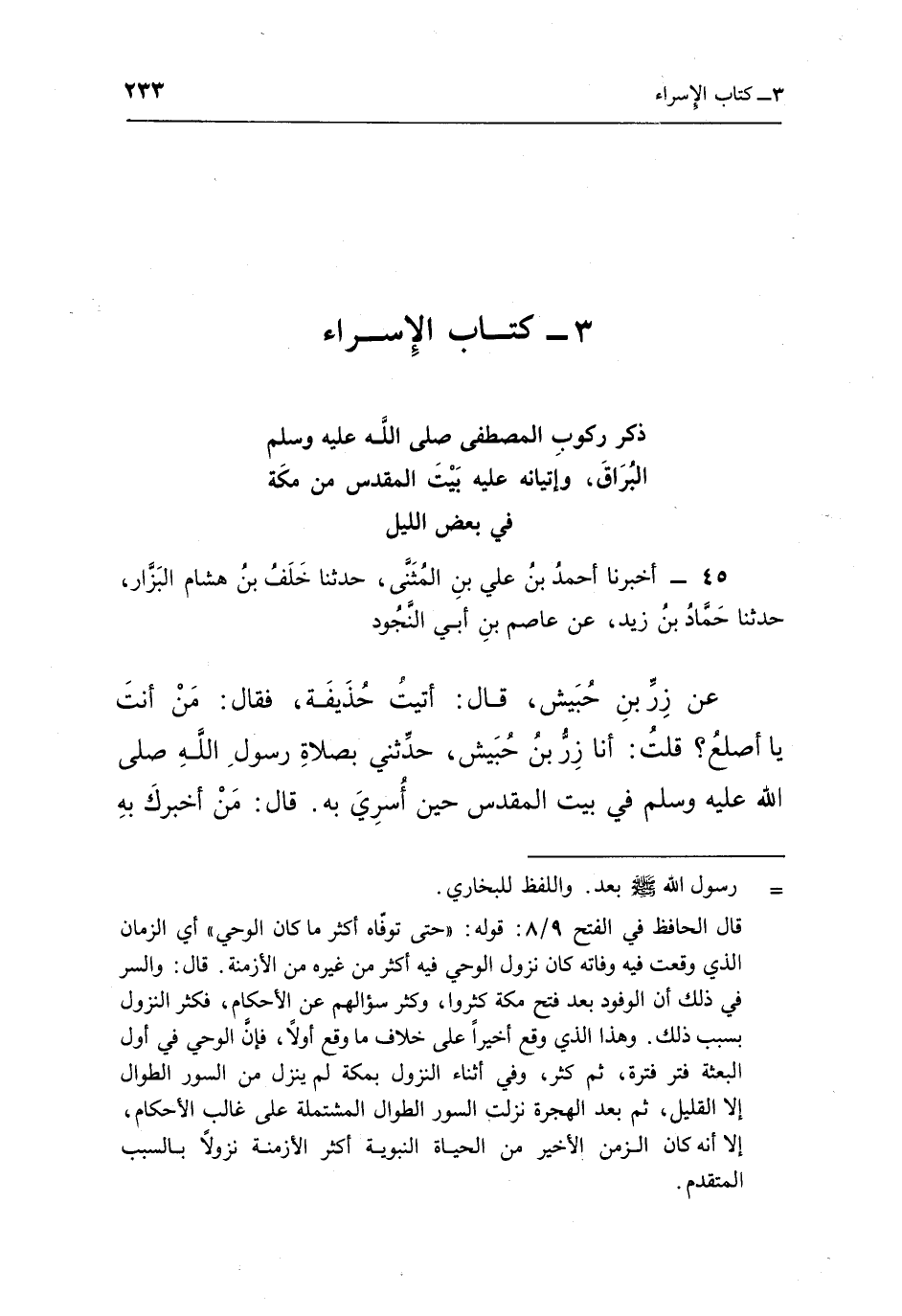 45 - أَخْبَرَنَا أَحْمَدُ بْنُ عَلِيِّ بْنِ الْمُثَنَّى حَدَّثَنَا خَلَفُ بْنُ هِشَامٍ الْبَزَّارُ حَدَّثَنَا حَمَّادُ بْنُ زَيْدٍ عَنْ عَاصِمِ بْنِ أَبِي النَّجُودِ عَنْ زِرِّ بْنِ حُبَيْشٍ قَالَ: أَتَيْتُ حُذَيْفَةَ فَقَالَ: مَنْ أَنْتَ يَا أَصْلَعُ؟ قُلْتُ: أَنَا زِرُّ بْنُ حُبَيْشٍ حَدِّثْنِي بِصَلَاةِ رَسُولِ اللَّهِ صَلَّى اللَّهُ عَلَيْهِ وَسَلَّمَ فِي بَيْتِ الْمَقْدِسِ حِينَ أُسْرِيَ بِهِ قال: "من أخبرك به3- كِتَابُ الْإِسْرَاءِ