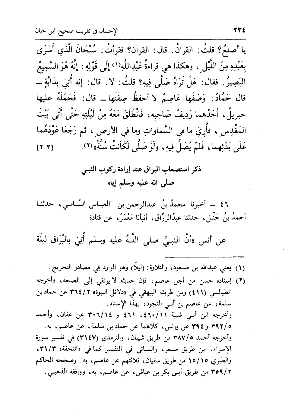 يَا أَصْلَعُ؟ قُلْتُ: الْقُرْآنُ قَالَ: الْقُرْآنُ؟ فَقَرَأْتُ: {سُبْحَانَ الَّذِي أَسْرَى بِعَبْدِهِ مِنَ اللَّيْلِ} وَهَكَذَا هِيَ قِرَاءَةُ عَبْدِ اللَّهِ1 إِلَى قَوْلِهِ: {إِنَّهُ هُوَ السَّمِيعُ الْبَصِيرُ} فَقَالَ: هَلْ تَرَاهُ صَلَّى فِيهِ؟ قُلْتُ: لَا قَالَ: "إِنَّهُ أُتِيَ بِدَابَّةٍ" قَالَ حَمَّادٌ وَصَفَهَا عَاصِمٌ لَا أَحْفَظُ صِفَتَهَا قَالَ: فَحَمَلَهُ عَلَيْهَا جِبْرِيلُ أَحَدُهُمَا رَدِيفُ صَاحِبِهِ فَانْطَلَقَ مَعَهُ مِنْ لَيْلَتِهِ حَتَّى أَتَى بَيْتَ الْمَقْدِسِ فَأُرِيَ مَا فِي السَّمَاوَاتِ وَمَا فِي الْأَرْضِ ثُمَّ رَجَعَا عَوْدَهُمَا عَلَى بَدْئِهِمَا فَلَمْ يُصَلِّ فِيهِ وَلَوْ صلى لكانت سنة2. [2:3]