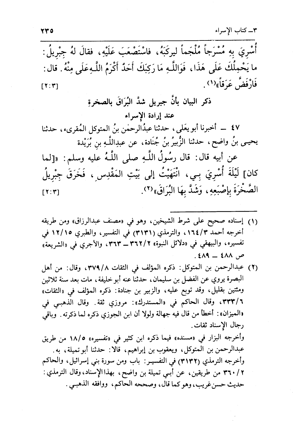 47 - أَخْبَرَنَا أَبُو يَعْلَى حَدَّثَنَا عَبْدُ الرَّحْمَنِ بْنُ المتوكل المقرىء حَدَّثَنَا يَحْيَى بْنُ وَاضِحٍ حَدَّثَنَا الزُّبَيْرُ بْنُ جُنَادَةَ عَنْ عَبْدِ اللَّهِ بْنِ بُرَيْدَةَ عَنْ أَبِيهِ قَالَ: قَالَ رَسُولُ اللَّهِ صَلَّى اللَّهُ عَلَيْهِ وَسَلَّمَ: "لَمَّا كَانَ لَيْلَةَ أُسْرِيَ بِي انْتَهَيْتُ إِلَى بَيْتِ الْمَقْدِسِ فَخَرَقَ جِبْرِيلُ الصَّخْرَةَ بإصبعه وشد بها البراق"1. [2:3]
