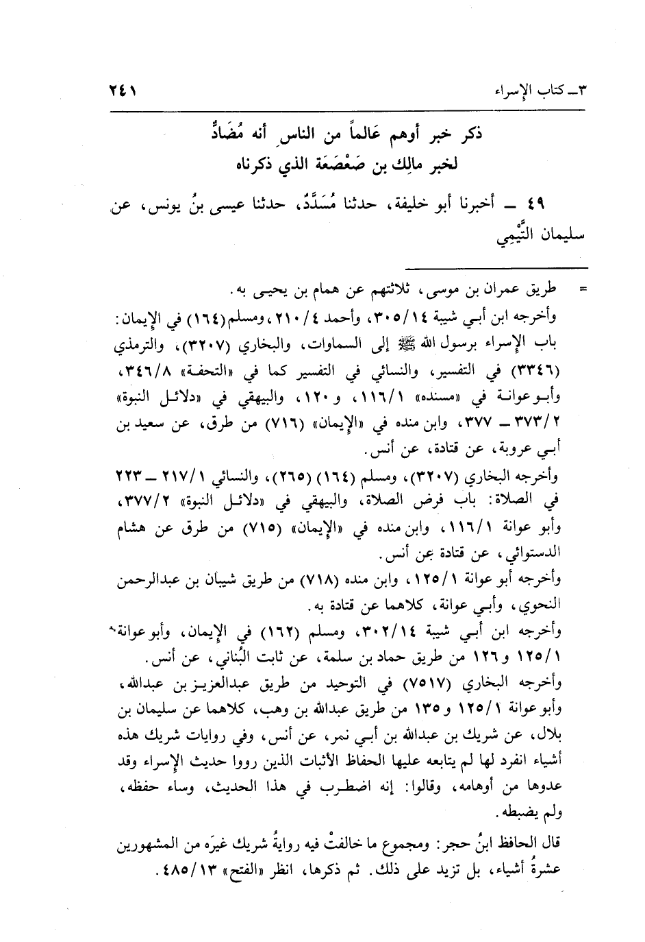 وأخرجه البخاري "7517" في التوحيد من طريق عبد العزيز بن عبد الله، وأبو عوانة 1/125 و135 من طريق عبد الله بن وهب، كلاهما عن سليمان بن بلال، عن شريك بن عبد الله بن أبي نمر، عن أنس، وفي روايات شريك هذه أشياء انفرد بها لم يتابعه عليها الحفاظ الأثبات الذين رووا حديث الإسراء وقد عدوها من أوهامه، وقالوا: إنه اضطرب في هذا الحديث، وساء حفظه، ولم يضبطه.