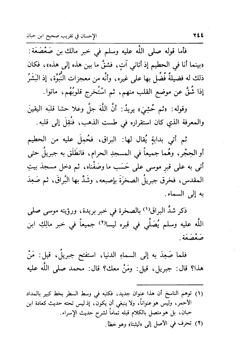 1 توهم الناسخ أن هذا عنوان جديد، فكتبه في وسط السطر بخط كبير بالمداد الأحمر، وليس هو عنواناً، ولا ينبغي أن يكون، إذ ليس تحته حديث كعادة ابن حبان، بل هو متصل بالكلام قبله تماماً لشرح حديث الإسراء.