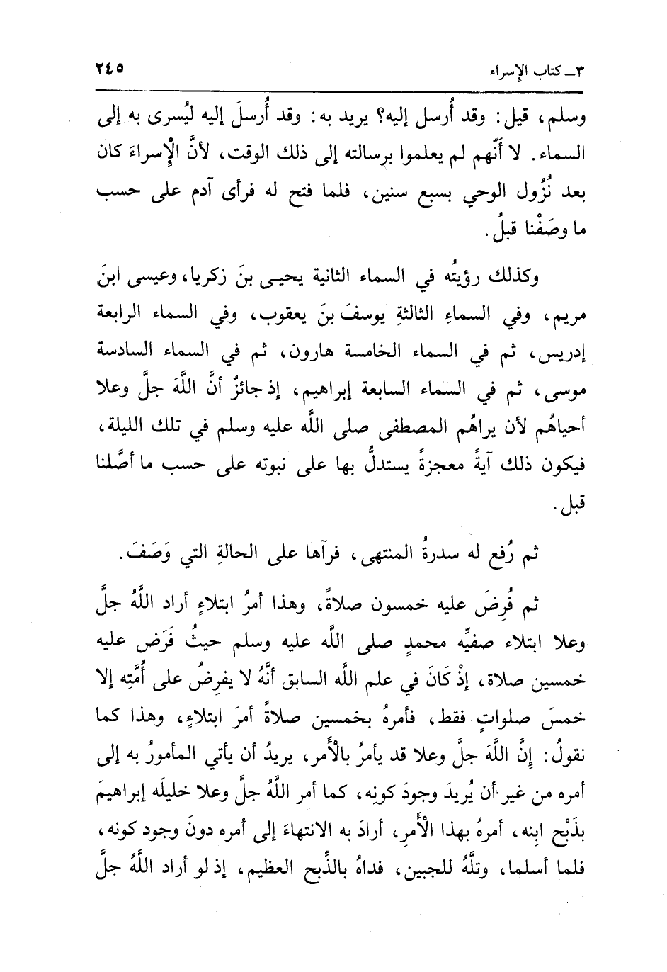 وَكَذَلِكَ رُؤْيَتُهُ فِي السَّمَاءِ الثَّانِيَةِ يَحْيَى بْنَ زَكَرِيَّا وَعِيسَى بن مَرْيَمَ وَفِي السَّمَاءِ الثَّالِثَةِ يُوسُفَ بْنَ يَعْقُوبَ وَفِي السَّمَاءِ الرَّابِعَةِ إِدْرِيسَ ثُمَّ فِي السَّمَاءِ الْخَامِسَةِ هَارُونَ ثُمَّ فِي السَّمَاءِ السَّادِسَةِ مُوسَى ثُمَّ فِي السَّمَاءِ السَّابِعَةِ إِبْرَاهِيمَ إِذْ جَائِزٌ أَنَّ اللَّهَ جَلَّ وَعَلَا أَحْيَاهُمْ لِأَنْ يَرَاهُمُ الْمُصْطَفَى صَلَّى اللَّهُ عَلَيْهِ وَسَلَّمَ فِي تِلْكَ اللَّيْلَةِ فَيَكُونُ ذَلِكَ آيَةً مُعْجِزَةً يُسْتَدَلُّ بِهَا عَلَى نُبُوَّتِهِ عَلَى حَسَبِ مَا أَصَّلْنَا قَبْلُ.