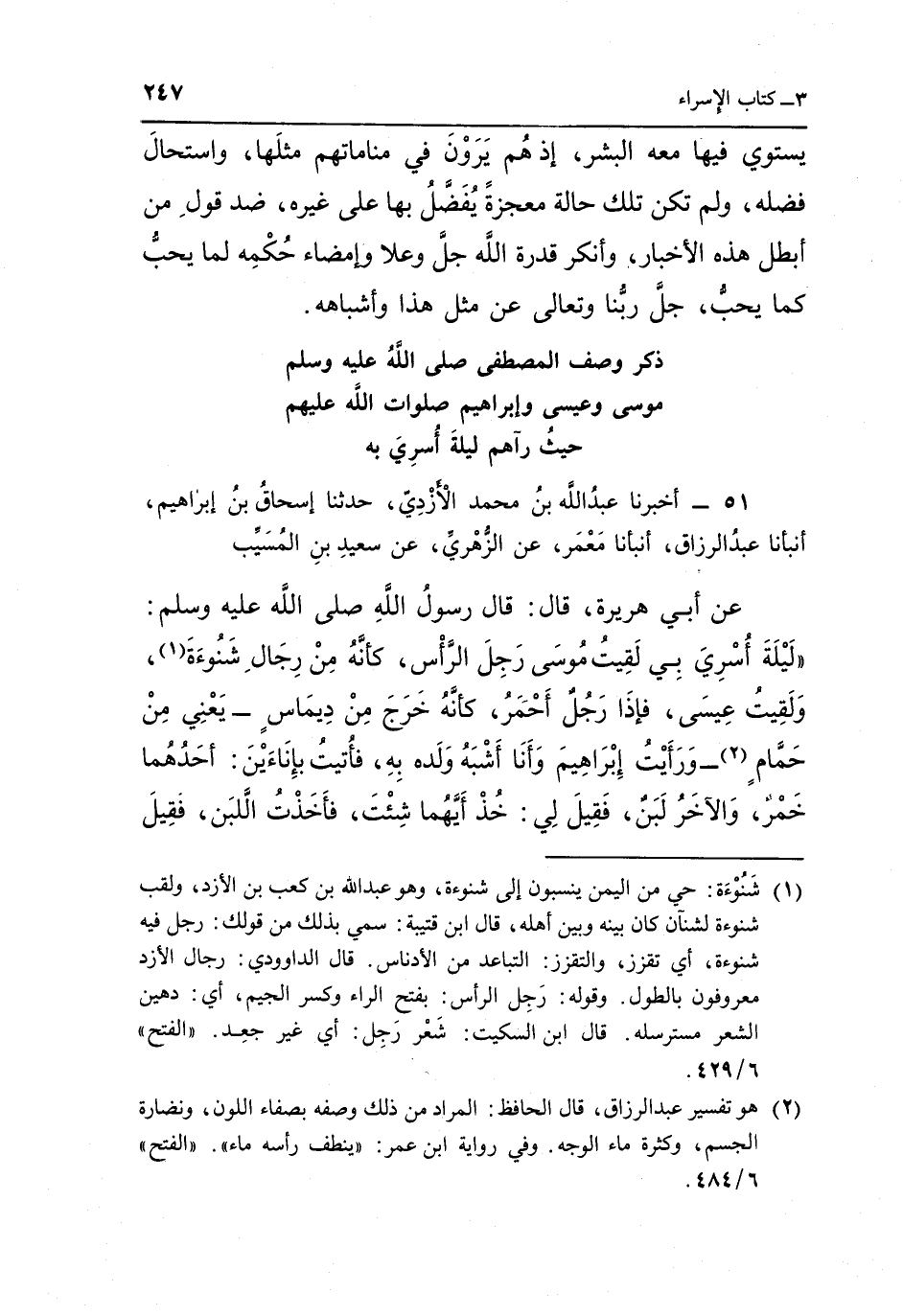 51 - أَخْبَرَنَا عَبْدُ اللَّهِ بْنُ مُحَمَّدٍ الْأَزْدِيُّ حَدَّثَنَا إِسْحَاقُ بْنُ إِبْرَاهِيمَ أَنْبَأَنَا عَبْدُ الرَّزَّاقِ أَنْبَأَنَا مَعْمَرٌ عَنِ الزُّهْرِيِّ عَنْ سَعِيدِ بْنِ الْمُسَيِّبِ عَنْ أَبِي هُرَيْرَةَ قَالَ: قَالَ رَسُولُ اللَّهِ صَلَّى اللَّهُ عَلَيْهِ وَسَلَّمَ: "لَيْلَةَ أُسْرِيَ بِي لَقِيتُ مُوسَى رَجِلَ الرَّأْسِ كَأَنَّهُ مِنْ رِجَالِ شَنُوءَةَ1 وَلَقِيتُ عِيسَى فَإِذَا رَجُلٌ أَحْمَرُ كَأَنَّهُ خَرَجَ مِنْ دِيمَاسٍ يَعْنِي مِنْ حَمَّامٍ2 وَرَأَيْتُ إِبْرَاهِيمَ وَأَنَا أَشْبَهُ وَلَدِهِ بِهِ فَأُتِيتُ بِإِنَاءَيْنِ أَحَدُهُمَا خَمْرٌ وَالْآخَرُ لبن فقيل