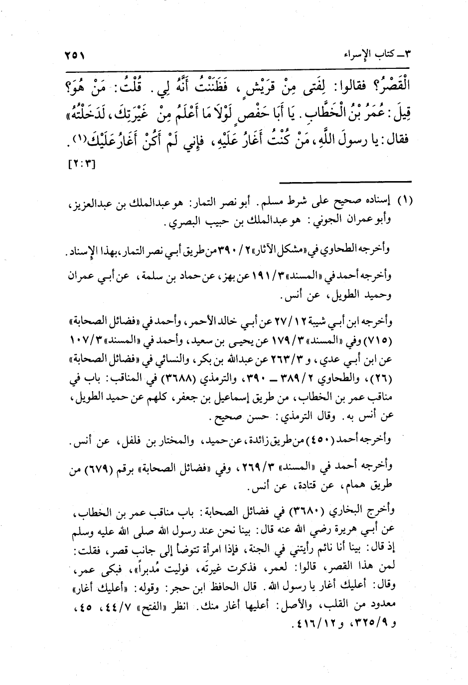 54 - أَخْبَرَنَا أَحْمَدُ بْنُ عَلِيِّ بْنِ الْمُثَنَّى حَدَّثَنَا أَبُو نَصْرٍ التَّمَّارُ حَدَّثَنَا حَمَّادُ بْنُ سَلَمَةَ عَنْ أَبِي عِمْرَانَ الْجَوْنِيِّ عَنْ أَنَسِ بْنِ مَالِكٍ قَالَ قَالَ رَسُولُ اللَّهِ صَلَّى اللَّهُ عَلَيْهِ وَسَلَّمَ: "دَخَلْتُ الْجَنَّةَ فَإِذَا أَنَا بِقَصْرٍ مِنْ ذَهَبٍ فَقُلْتُ: لِمَنْ هَذَا الْقَصْرُ؟ فَقَالُوا: لِفَتًى مِنْ قُرَيْشٍ فَظَنَنْتُ أَنَّهُ لِي قُلْتُ: مَنْ هُوَ قِيلَ عُمَرُ بْنُ الْخَطَّابِ. يَا أَبَا حَفْصٍ لَوْلَا مَا أَعْلَمُ مِنْ غَيْرَتِكَ لَدَخَلْتُهُ" فَقَالَ: "يَا رَسُولَ اللَّهِ مَنْ كُنْتُ أَغَارُ عَلَيْهِ فَإِنِّي لَمْ أَكُنْ أَغَارُ عليك"1. [2:3]