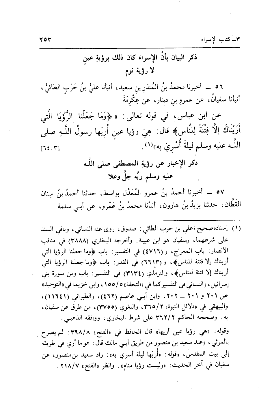 56 - أَخْبَرَنَا مُحَمَّدُ بْنُ الْمُنْذِرِ بْنِ سَعِيدٍ أَنْبَأَنَا عَلِيُّ بْنُ حَرْبٍ الطَّائِيُّ أَنْبَأَنَا سُفْيَانُ عَنْ عَمْرِو بْنِ دِينَارٍ عَنْ عِكْرِمَةَ عَنِ بن عَبَّاسٍ فِي قَوْلِهِ تَعَالَى: {وَمَا جَعَلْنَا الرُّؤْيا الَّتِي أَرَيْنَاكَ إِلَّا فِتْنَةً لِلنَّاسِ} قَالَ هِيَ رُؤْيَا عَيْنٍ أُرِيَهَا رَسُولُ اللَّهِ صَلَّى اللَّهُ عَلَيْهِ وَسَلَّمَ لَيْلَةَ أُسْرِيَ بِهِ"1. [64:3]