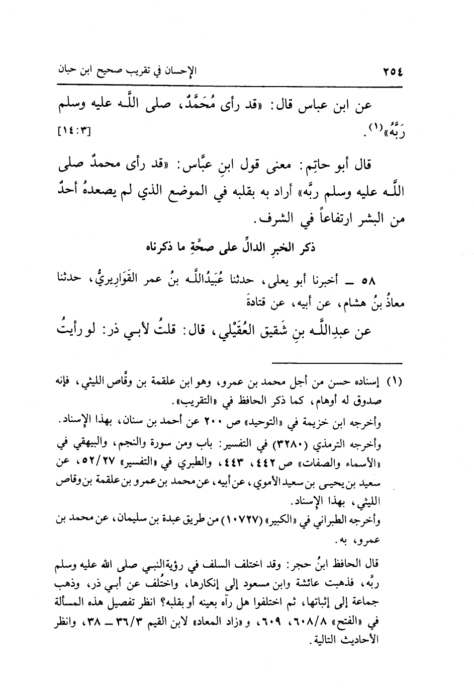 قَالَ أَبُو حَاتِمٍ: مَعْنَى قَوْلِ ابْنِ عَبَّاسٍ: "قَدْ رَأَى مُحَمَّدٌ صَلَّى اللَّهُ عَلَيْهِ وَسَلَّمَ رَبَّهُ" أَرَادَ بِهِ بِقَلْبِهِ فِي الْمَوْضِعِ الَّذِي لَمْ يَصْعَدْهُ أَحَدٌ من البشر ارتفاعا في الشرف.
