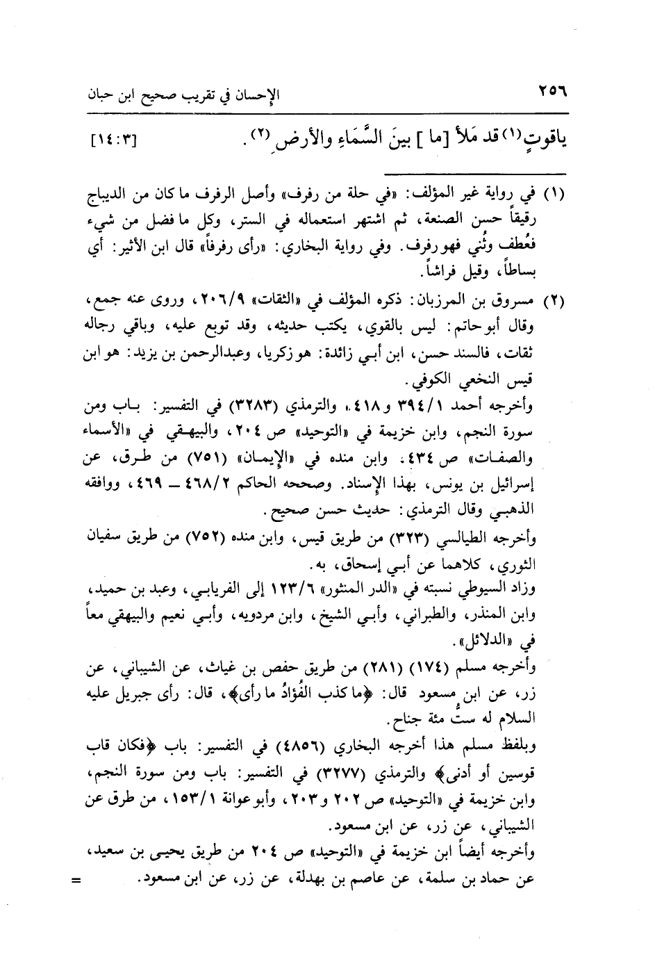 59 - أَخْبَرَنَا مُحَمَّدُ بْنُ صَالِحِ بْنِ ذَرِيحٍ بِعَكْبَرَا حَدَّثَنَا مسروق بن المرزبان حدثنا بن أَبِي زَائِدَةَ حَدَّثَنَا إِسْرَائِيلُ عَنْ أَبِي إِسْحَاقَ عن عبد الرحمن بن يزيد عن بن مَسْعُودٍ فِي قَوْلِهِ تَعَالَى: {مَا كَذَبَ الْفُؤَادُ مَا رَأَى} قَالَ: "رَأَى رَسُولُ اللَّهِ صَلَّى اللَّهُ عَلَيْهِ وَسَلَّمَ جِبْرِيلَ فِي حُلَّةٍ مِنْ يَاقُوتٍ1قَدْ ملأ ما بين السماء والأرض" 2. [14:3]