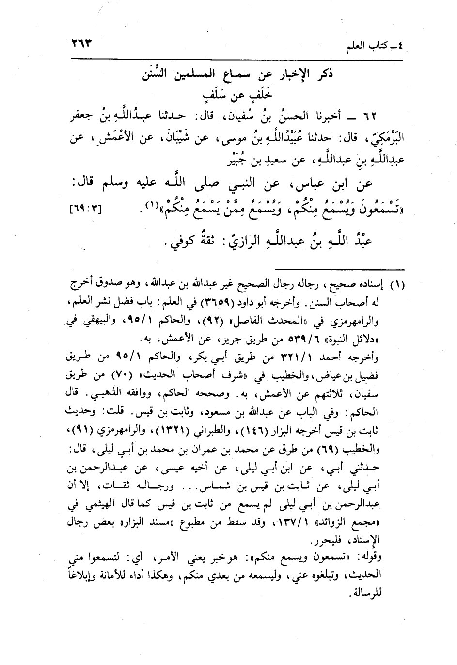 عن بن عَبَّاسٍ عَنِ النَّبِيِّ صَلَّى اللَّهُ عَلَيْهِ وَسَلَّمَ قَالَ: "تَسْمَعُونَ وَيُسْمَعُ مِنْكُمْ وَيُسْمَعُ مِمَّنْ يَسْمَعُ مِنْكُمْ"1. [69:3]