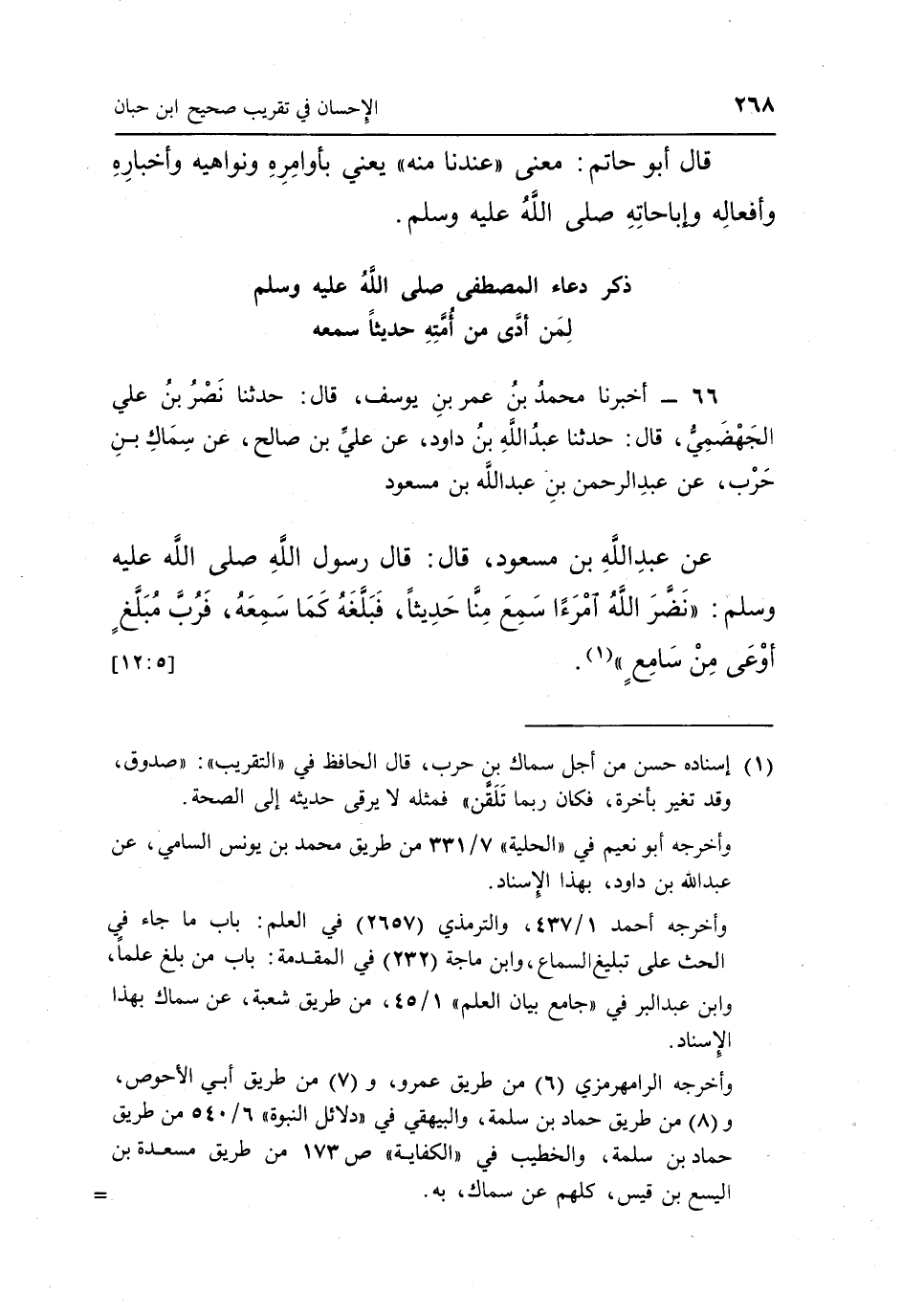 66 - أَخْبَرَنَا مُحَمَّدُ بْنُ عُمَرَ بْنِ يُوسُفَ قَالَ حَدَّثَنَا نَصْرُ بْنُ عَلِيٍّ الْجَهْضَمِيُّ قَالَ حَدَّثَنَا عَبْدُ اللَّهِ بْنُ دَاوُدَ عَنْ عَلِيِّ بْنِ صَالِحٍ عَنْ سِمَاكِ بْنِ حَرْبٍ عَنْ عَبْدِ الرَّحْمَنِ بْنِ عَبْدِ اللَّهِ بْنِ مَسْعُودٍ عَنْ عَبْدِ الله بن مسعود قَالَ رَسُولُ اللَّهِ صَلَّى اللَّهُ عَلَيْهِ وَسَلَّمَ: "نَضَّرَ اللَّهُ امْرَأً سَمِعَ مِنَّا حَدِيثًا فَبَلَّغَهُ كَمَا سَمِعَهُ فَرُبَّ مُبَلَّغٍ أَوْعَى مِنْ سَامِعٍ"1. [12:5]
